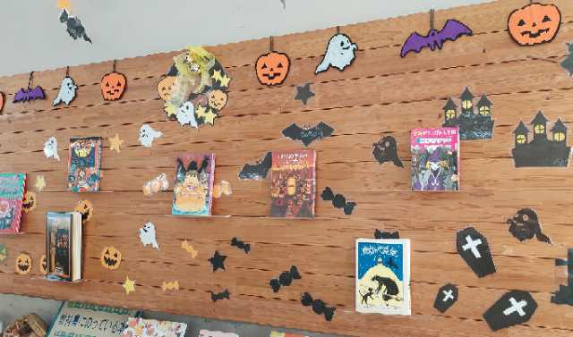 図書室は季節ごとに模様替えをしています。今はハロウィンの世界です。お化けの本の紹介がされています。いろいろな本を読んでほしいと思います。