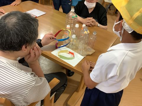 今日は、いよいよ、自分で考えて作ったリハビリ道具や身体機能改善の道具を利用者の方々に使ってもらう日です。どきどきしながら、トレーニングタイムが始まりました。