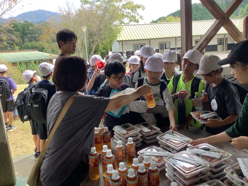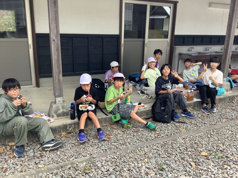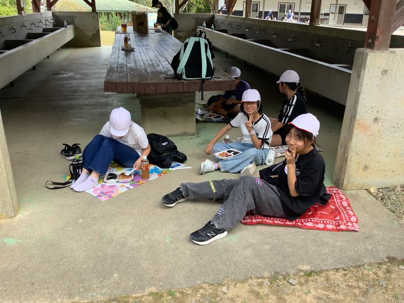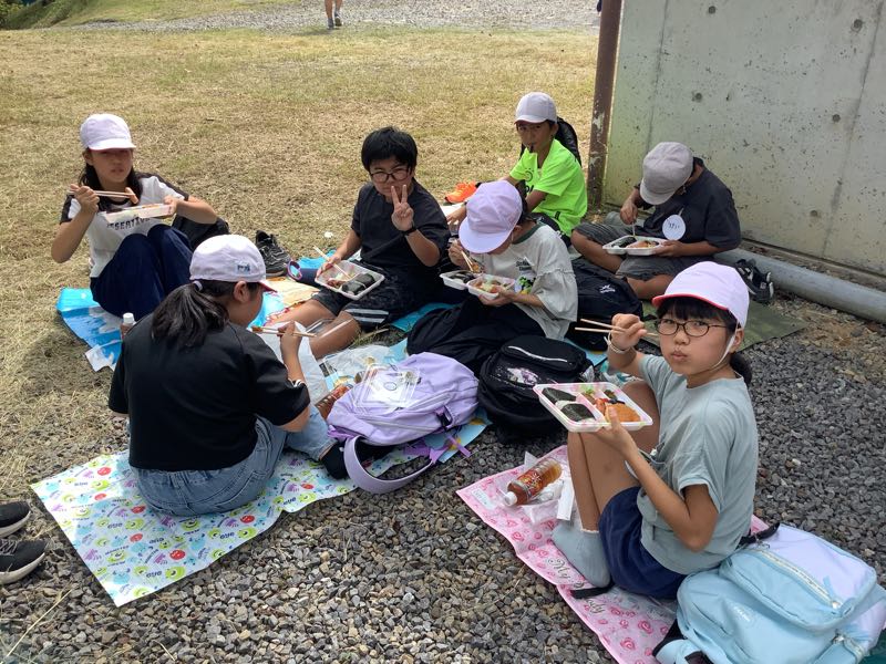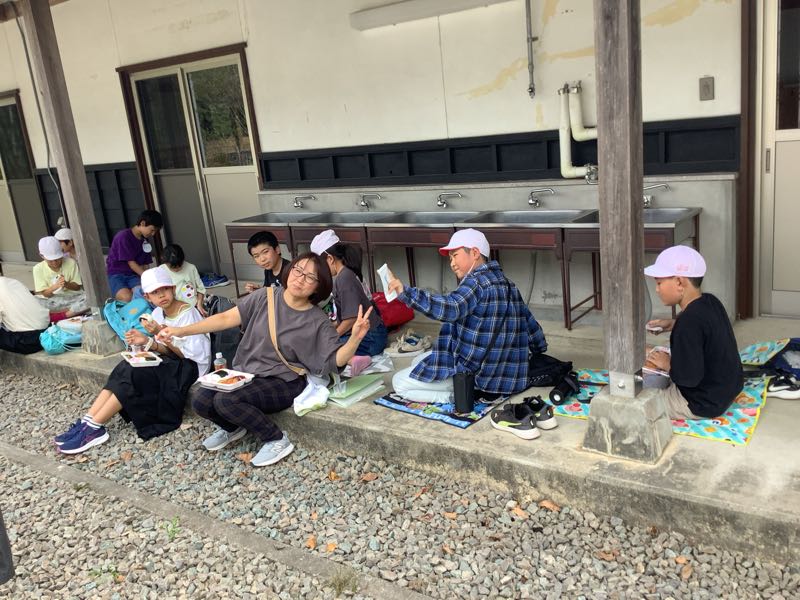 学年写真を撮り終え、美味しいお弁当をいただいています。