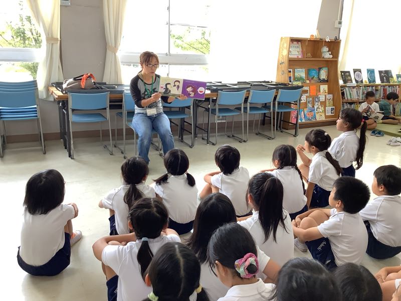 いつもは朝の時間に読み聞かせがありますが、今日はなかよしタイムです。図書室で楽しく図書館ボラティアさんの読み聞かせを聞くことができました。
