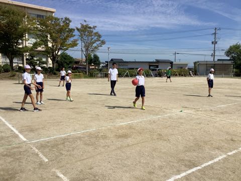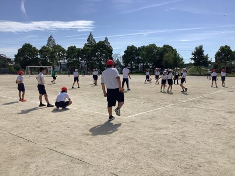 カラッと晴れたなかよしタイム、月曜日から福北小に来ている教育実習生の先生と、6年生がドッジボールで勝負しています。