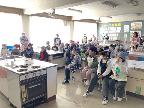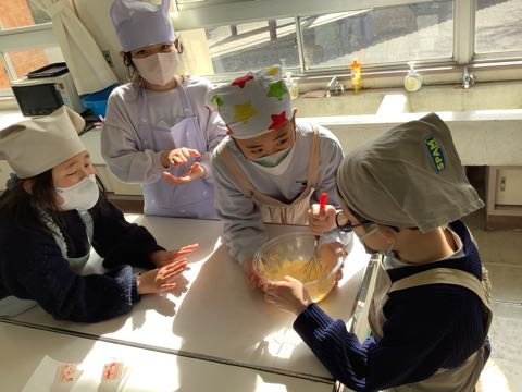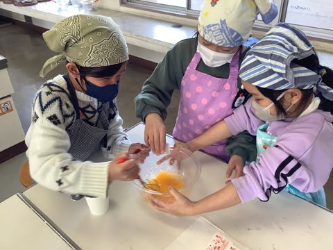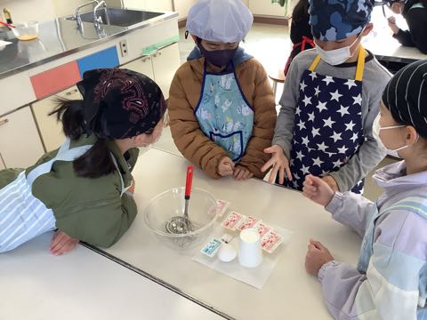エプロンとマスク、三角巾も身に付けて、調理も行いました。