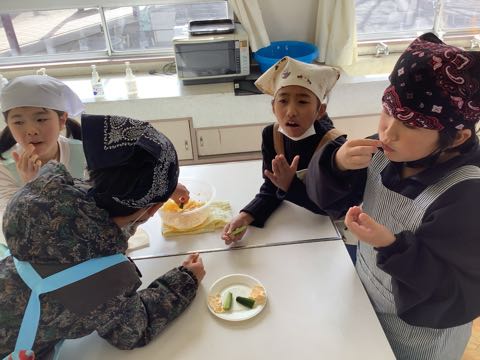 グループで仲良く材料を混ぜて、美味しい調味料を作り、野菜につけて食べました。