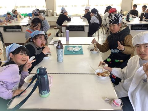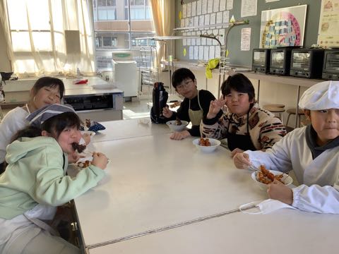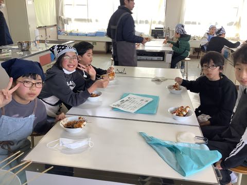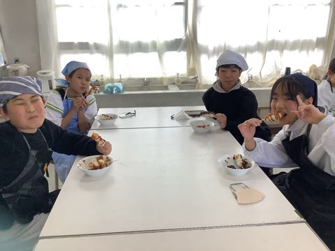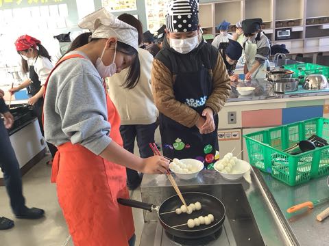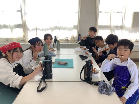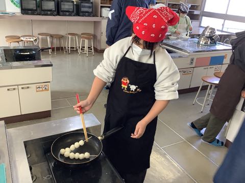 フライパンで香ばしく焼いた後、甘辛の醤油とあんこをつけて、試食しました。お米ができるまで、たくさんの時間と作る人たちの愛情が必要であることを知った5年生。一口ずつ大切に団子を食べました。