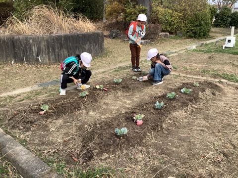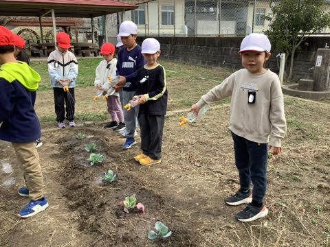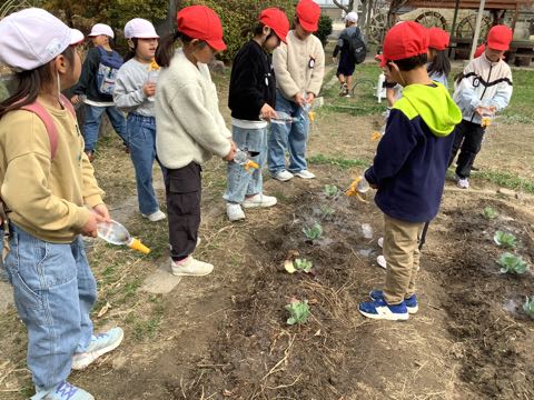 3年生から始まる理科の授業に備えて、植物の勉強をします。観察用のキャベツを、プール横の学年園に植えたので、みんなで協力して毎日水をやっています。