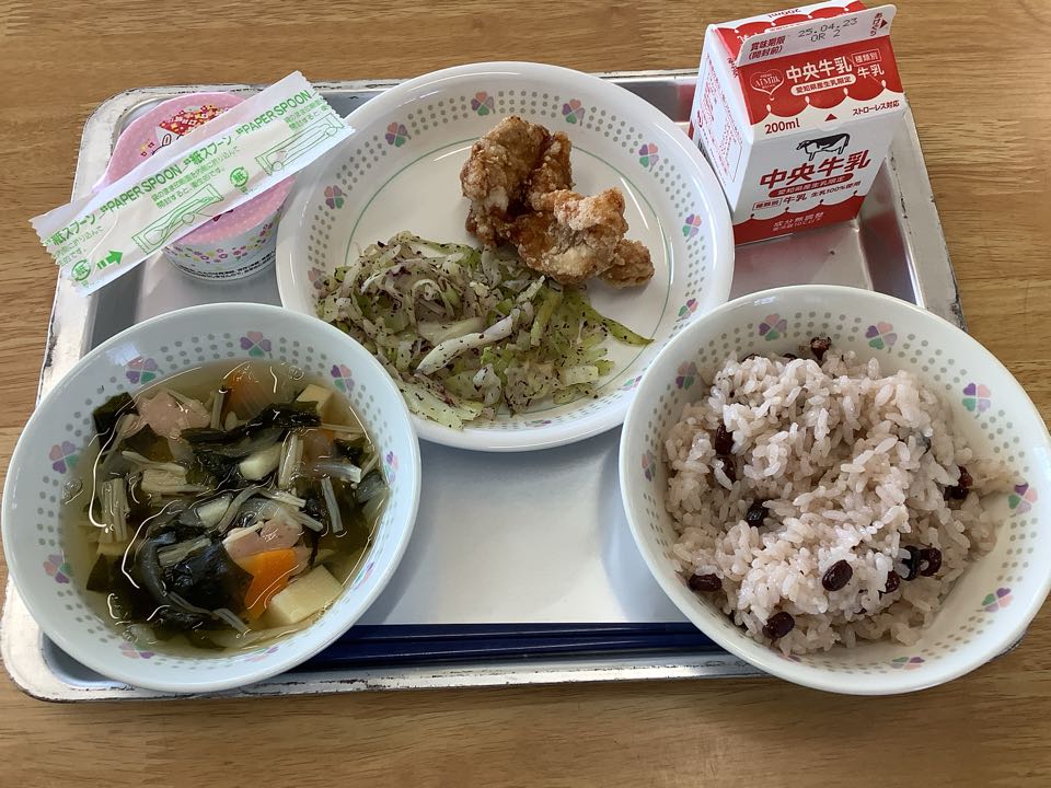 今日の給食は、1年生の入学と各学年の進級を祝うお祝い給食です。食べ慣れないかなあと思ったお赤飯もおいしそうにぱくぱく食べていました。若竹汁には、桜の花形のかまぼこ。鶏肉ごまがらめは、子ども好みの甘めの味付け。キャベツのゆかり和えの他に、お祝いいちごゼリーがデザートについています。