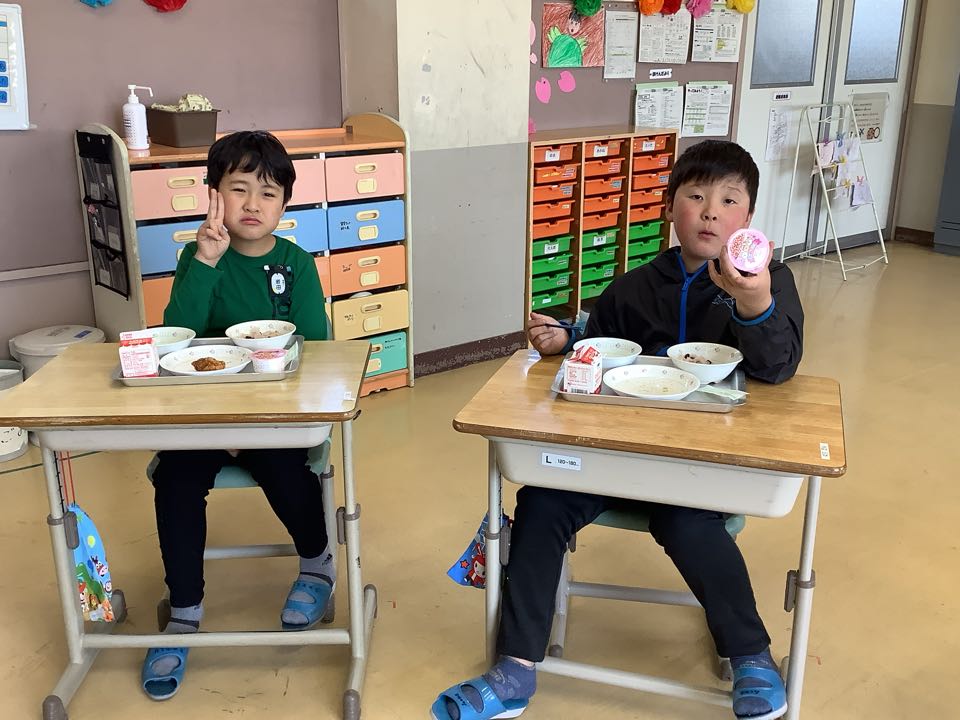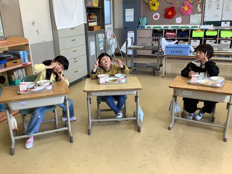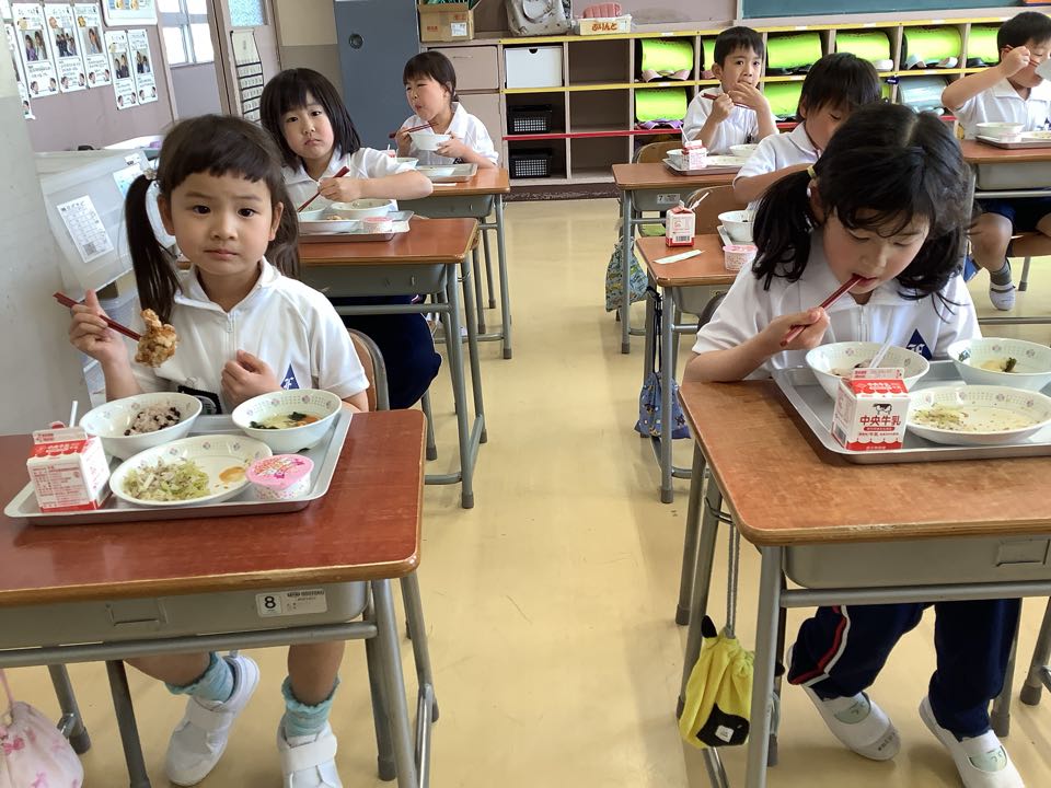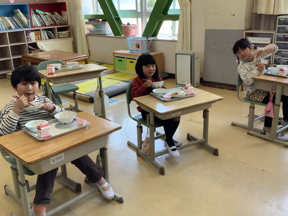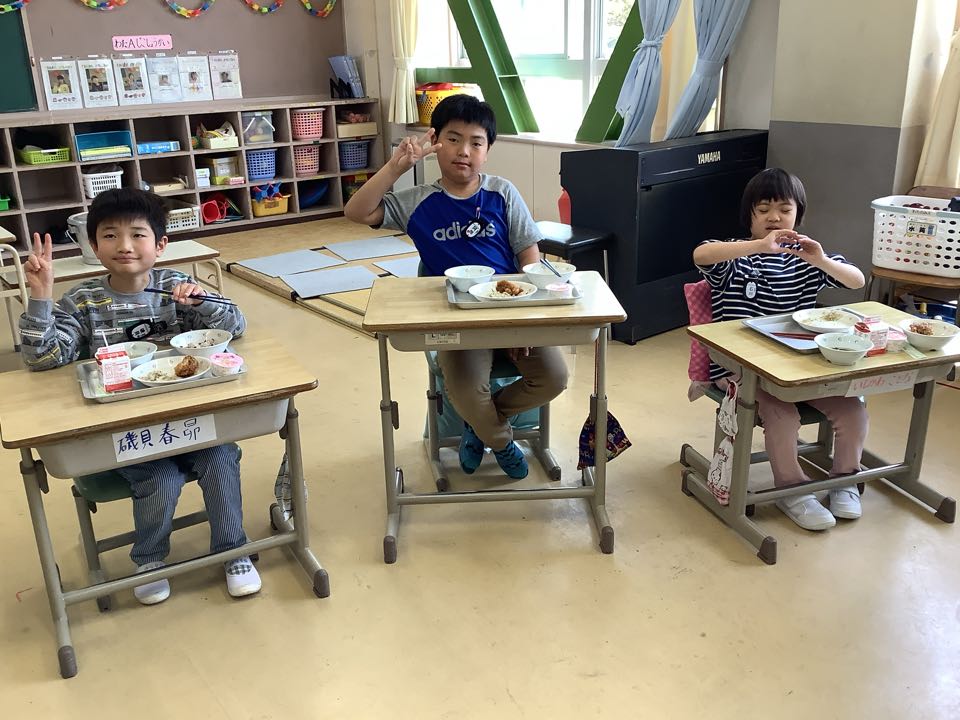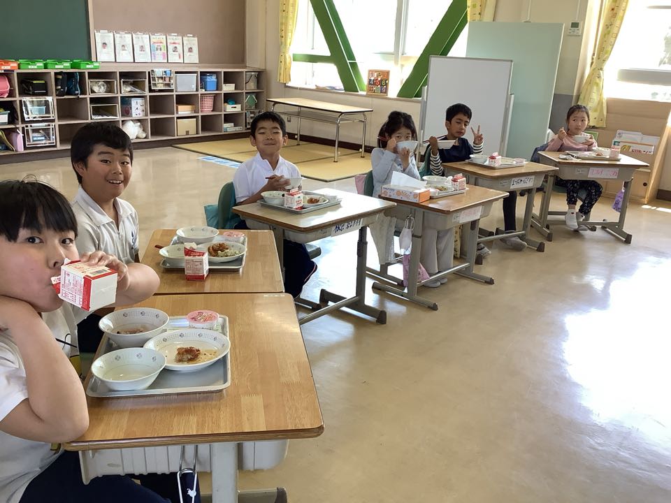 1年生のいるクラスを訪ねてみました。保育園や幼稚園と比べると、ずいぶん量が多いと思いますが、がんばって食べています。たくさん食べて元気に学校に来てくださいね。入学・進級おめでとうございます。
