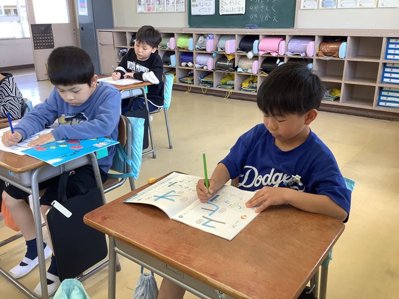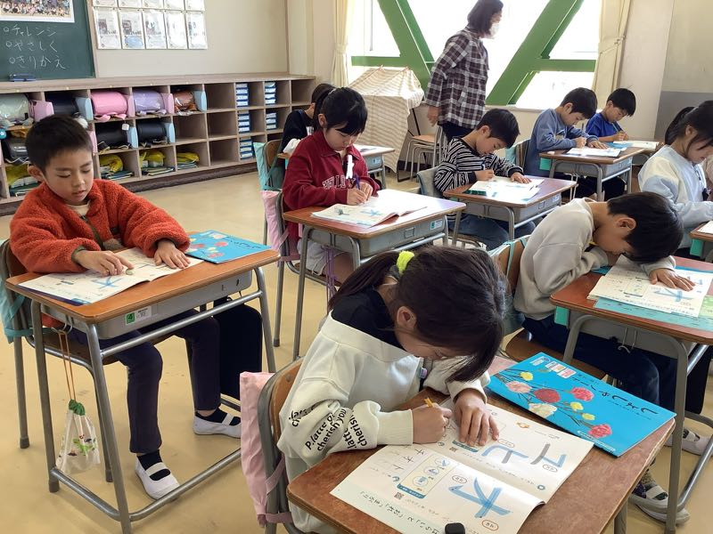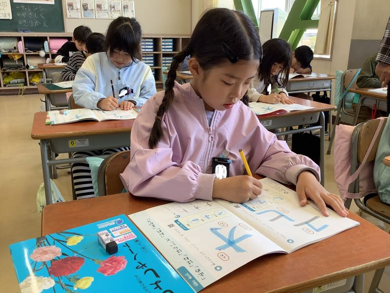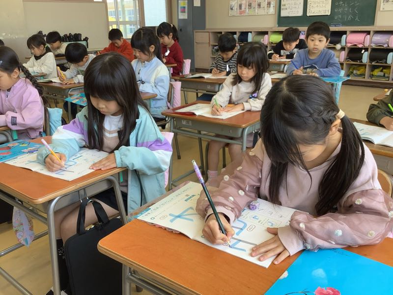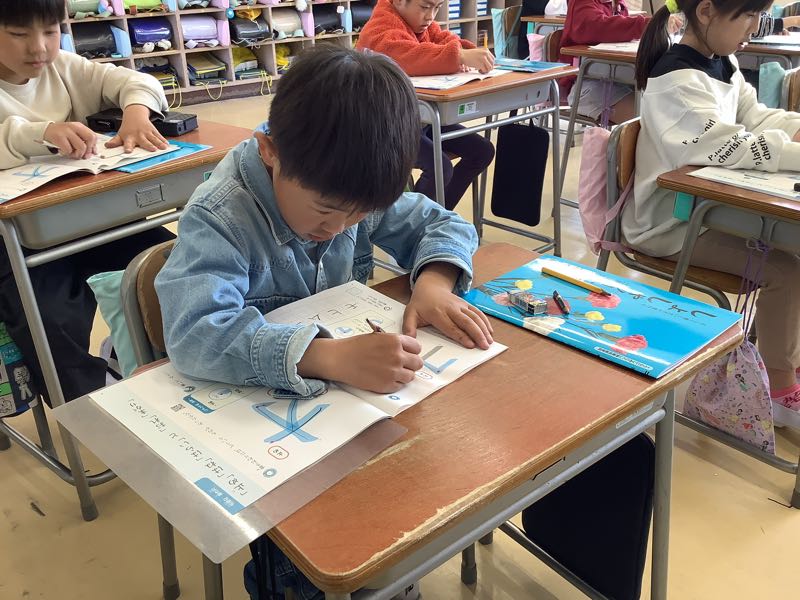 書写の授業が始まりました。文字を丁寧に書くには、足を「ぺた」、背筋を「ぴん」、鉛筆を持たない方の手を「とん」の「ぴた・ぴん・とん」が欠かせません。