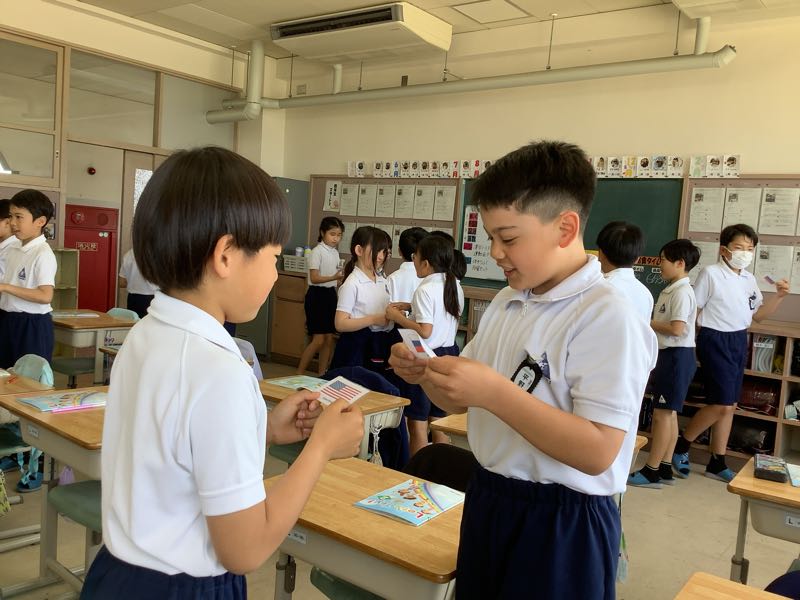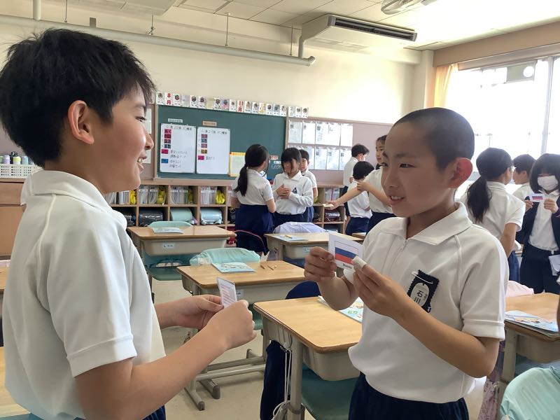 外国語の授業で世界のあいさつについて学習しました。「こんにちは」や「Hello」の他にサウジアラビア、インドネシアなどのあいさつを使って友達と自己紹介をしました。