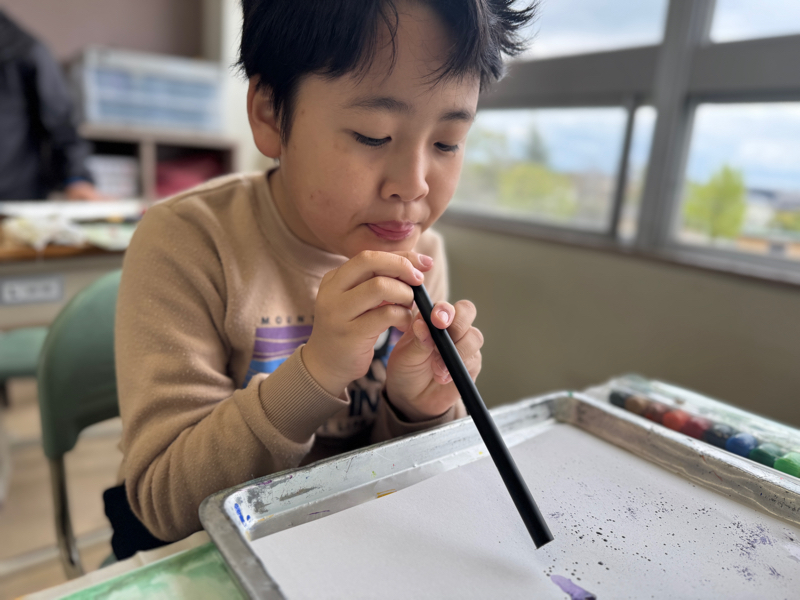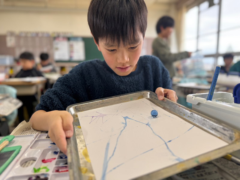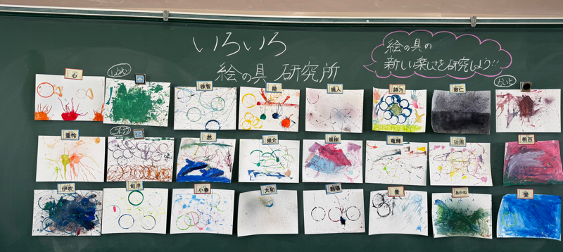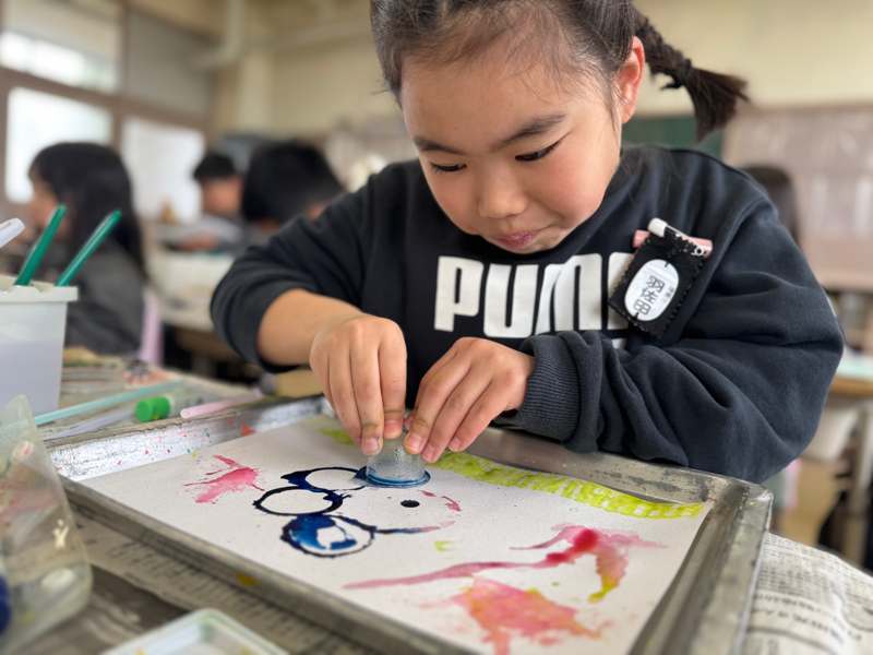図工で筆以外のものを使って、絵の具の新しい楽しさを研究しました。ストロー、ビー玉、歯ブラシなど身の回りのものも、子ども達の手にかかれば立派な画材に早変わり!みんな思い思いの素敵な作品を作り上げました。