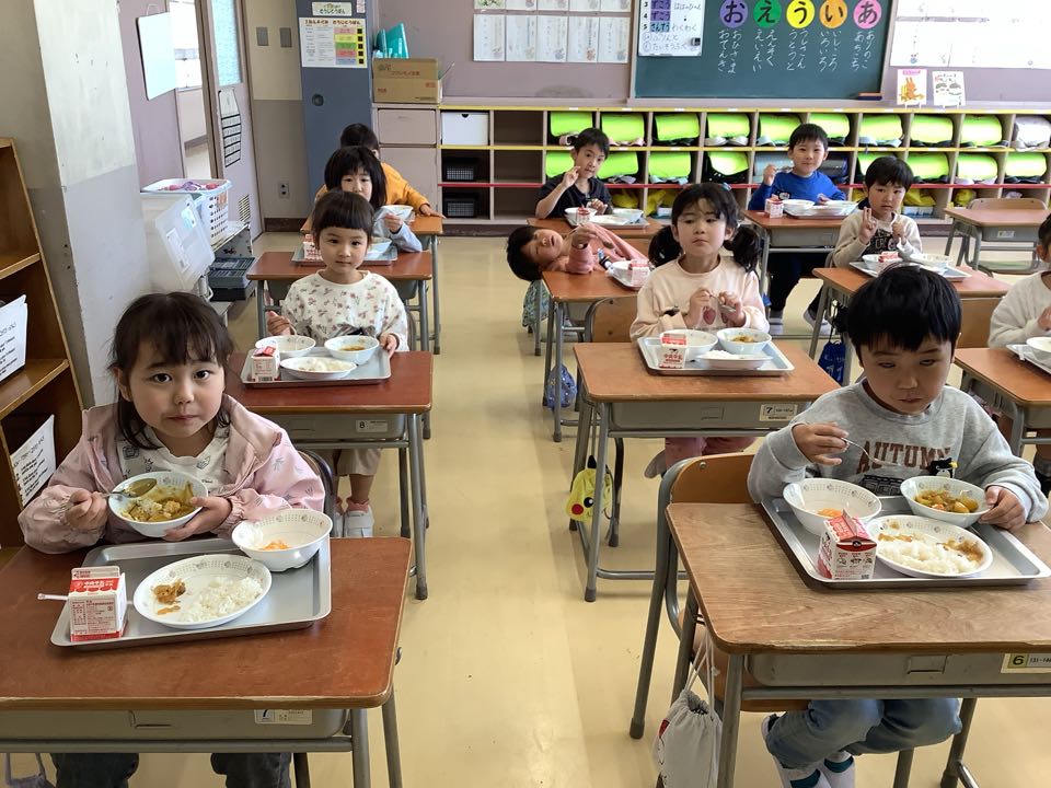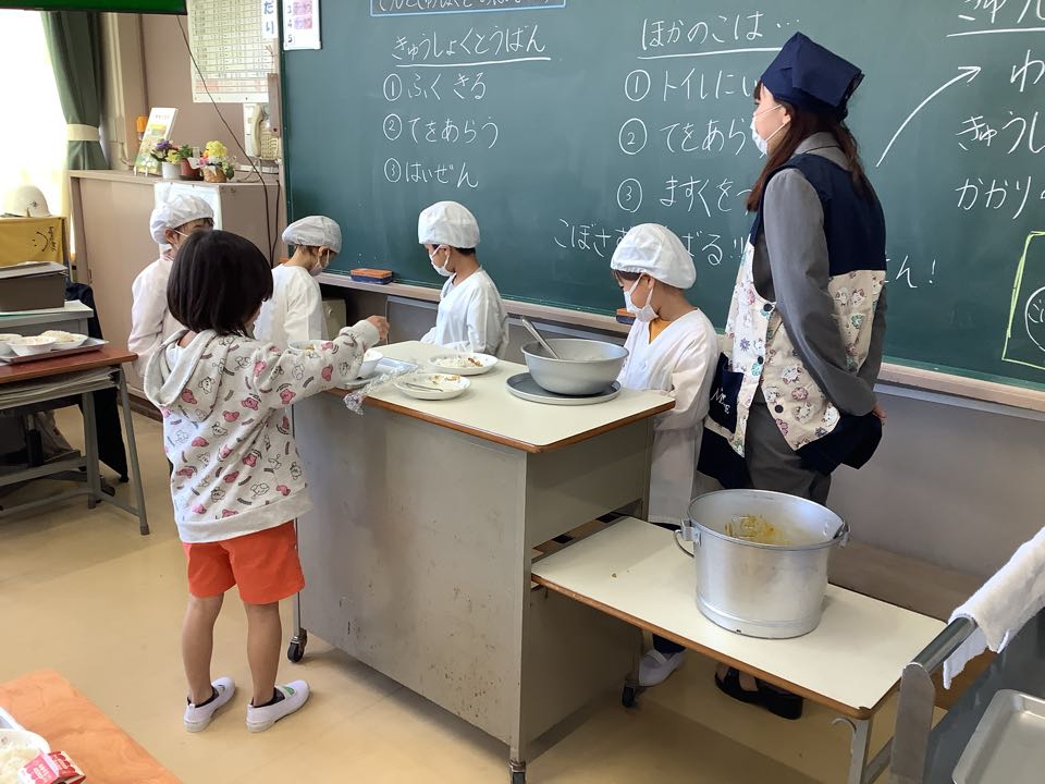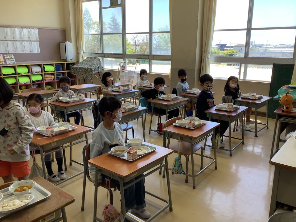 1年生は、今日から給食が始まりました。初めての給食当番にどきどき。手をおひざに置いて、静かに待ちながらわくわく。