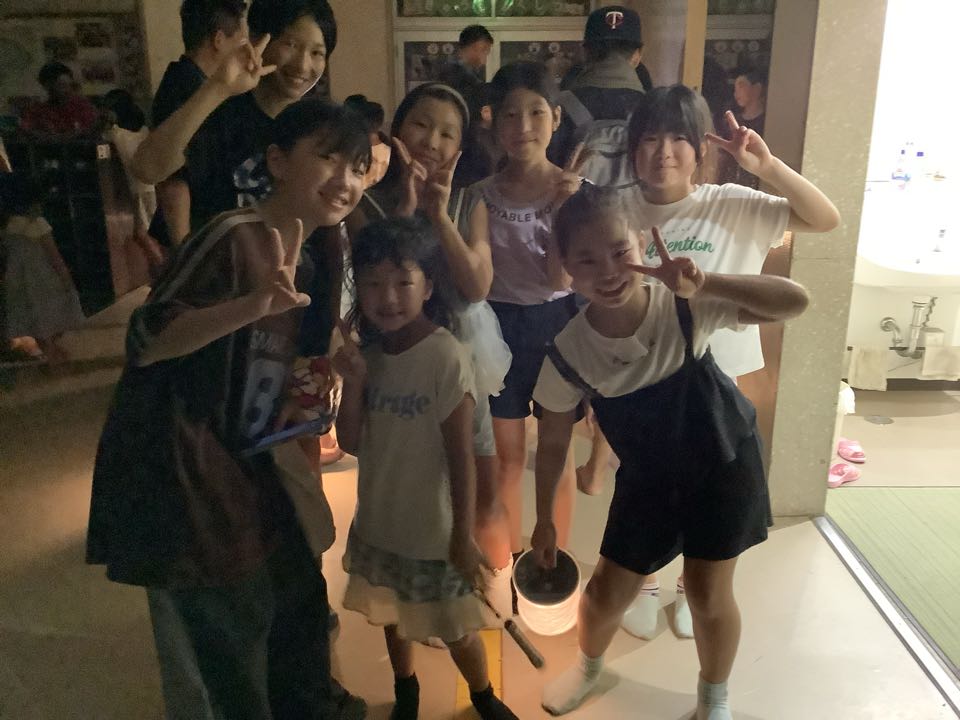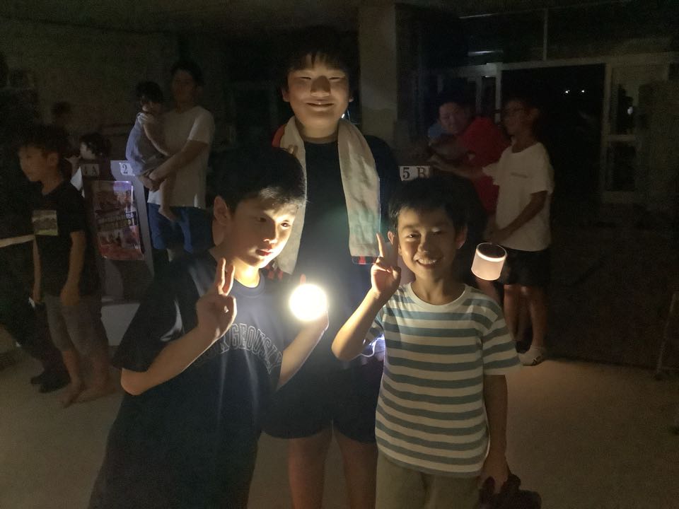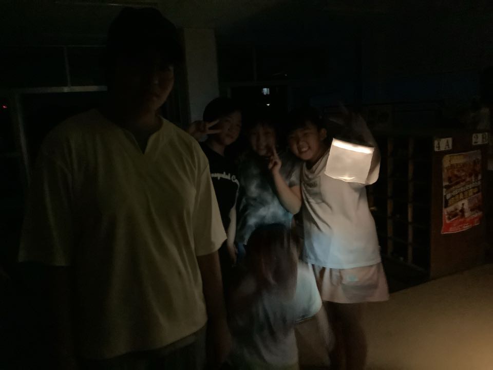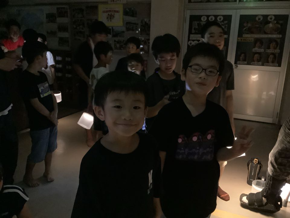 すっかり夜もふけました。「学校きもだめし」が始まりました。出発する前の元気子どもたちの様子です。3階の方からは、「キャー!」と悲鳴が聞こえてきます。理科室も音楽室もあるので心配です。どうか無事に帰ってきてくださいね。