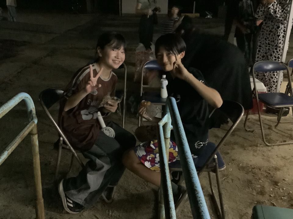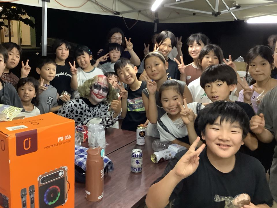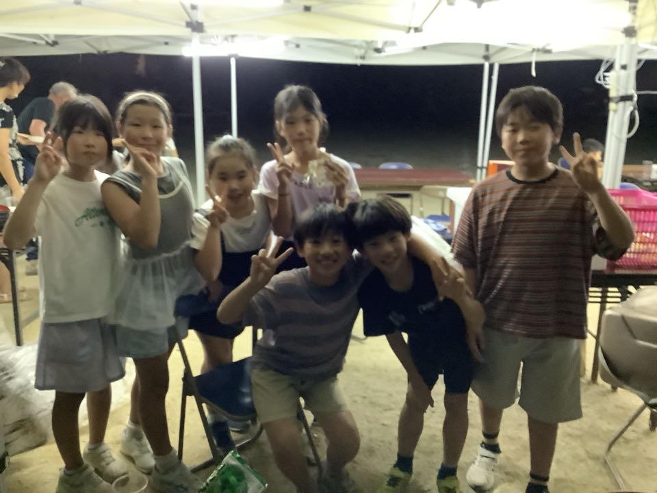 盛りだくさんの1日が終わろうとしています。今日は特別、遅い時間に外でのんびり過ごします。明るいライトの下で、ほっとした表情の子どもたちです。