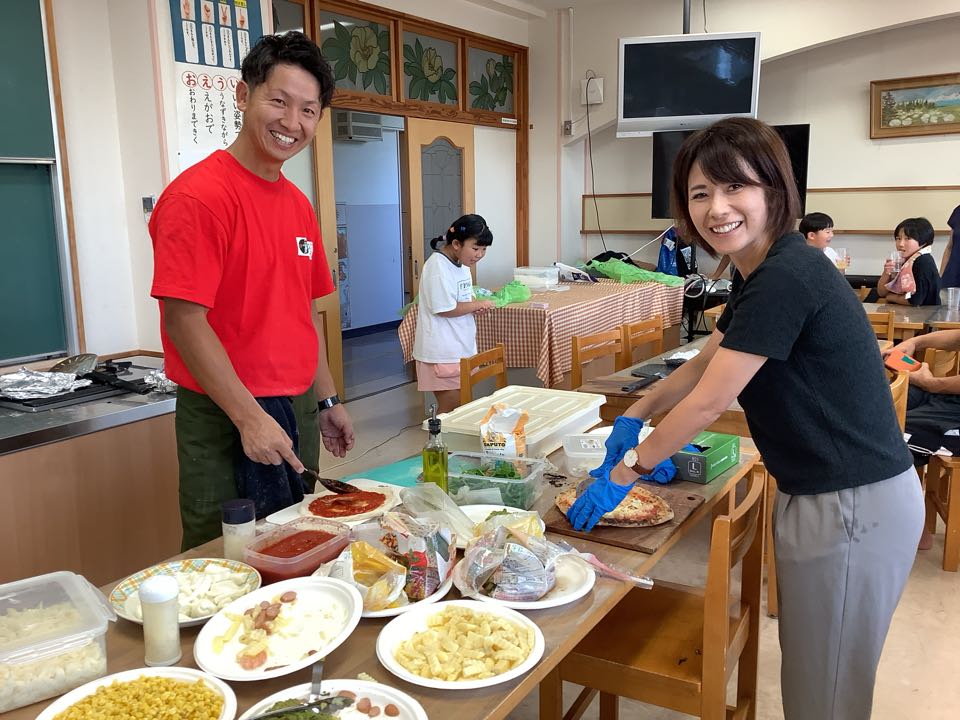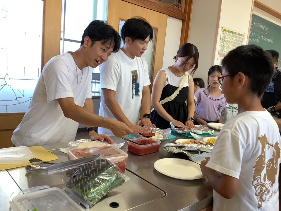 今回は、おやじの会に参加する教員もいました。ピザ作り終盤、先に作った子どもたちの指導を受けながら、オリジナルピザを作りました。