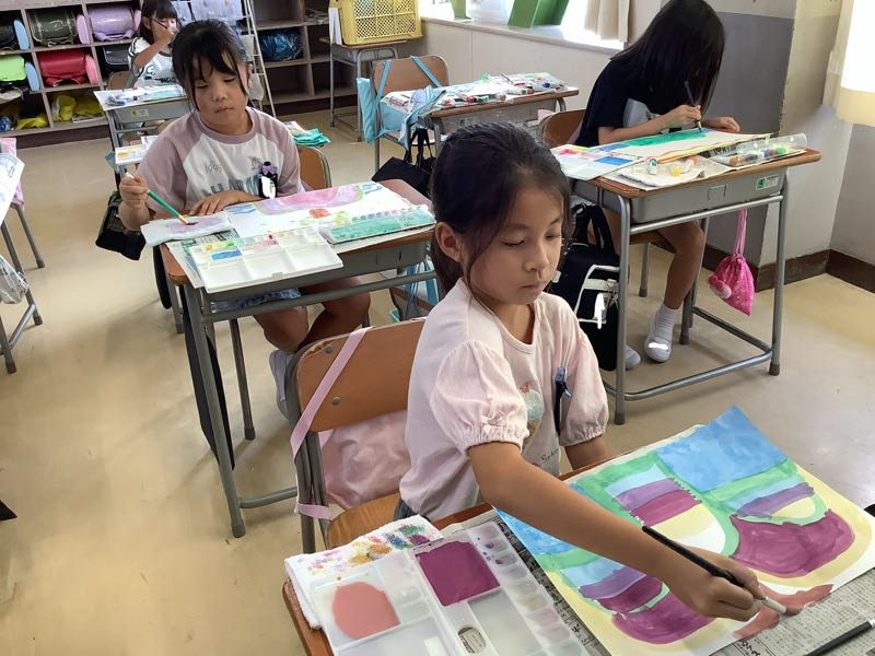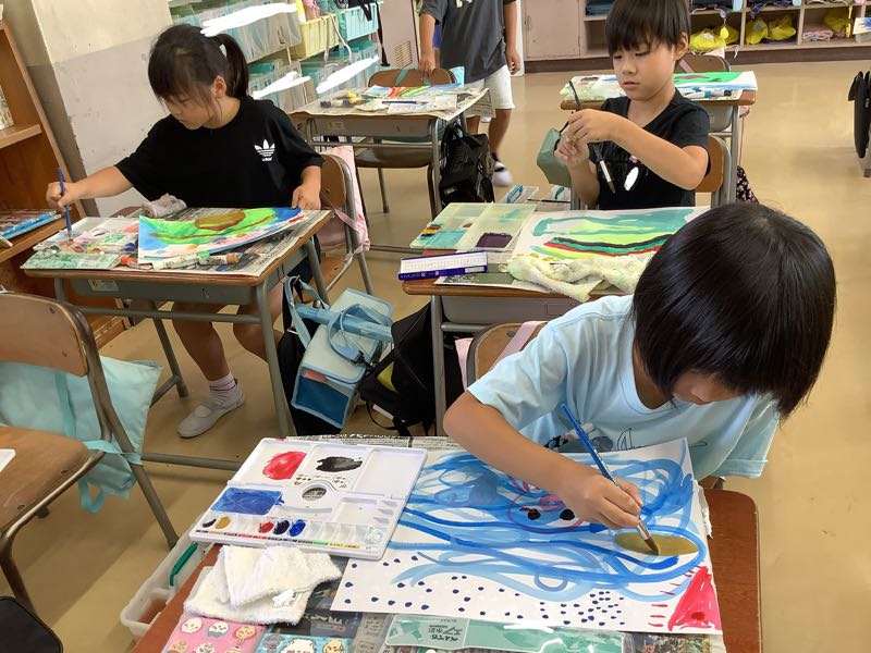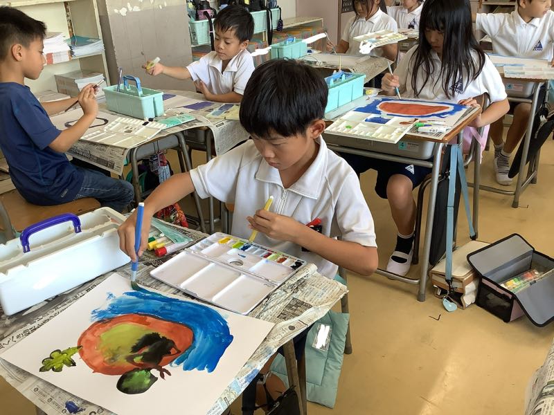 今回は絵の具で、自分だけの「えのぐじま」を描きました。筆をくねくね、ちょんちょんと動かして、素敵な島を完成させることができました。