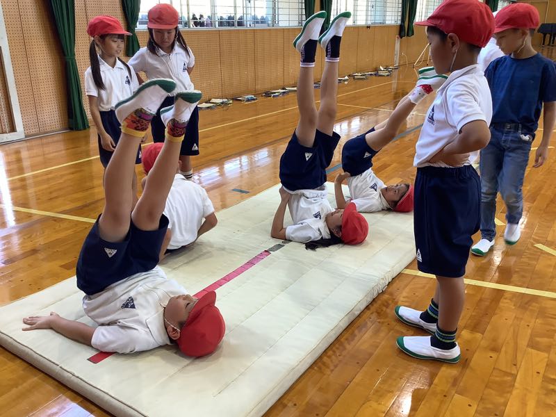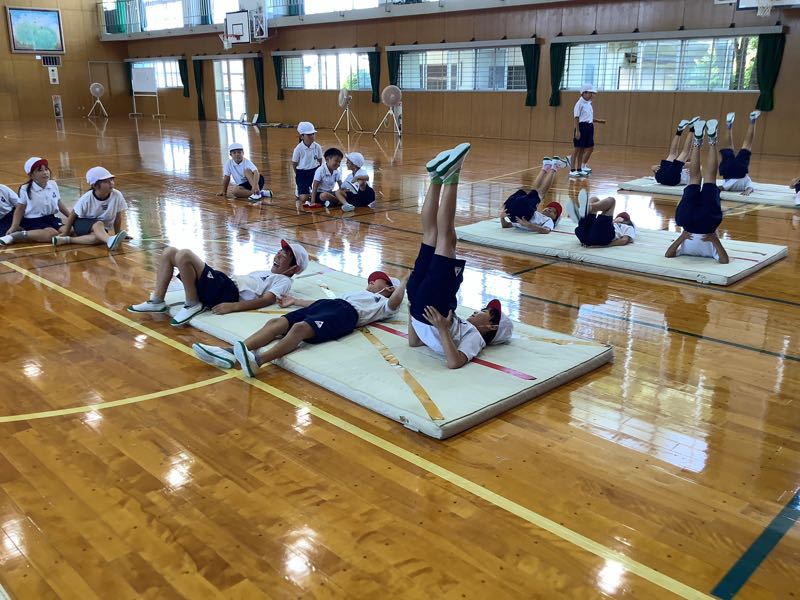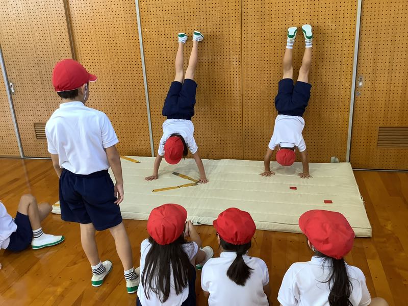 色々なものや動物になりきるわざを知った子どもたち。今日は、「アンテナ(足上げ)」「やもり(壁つたいの倒立)」にチャレンジです。