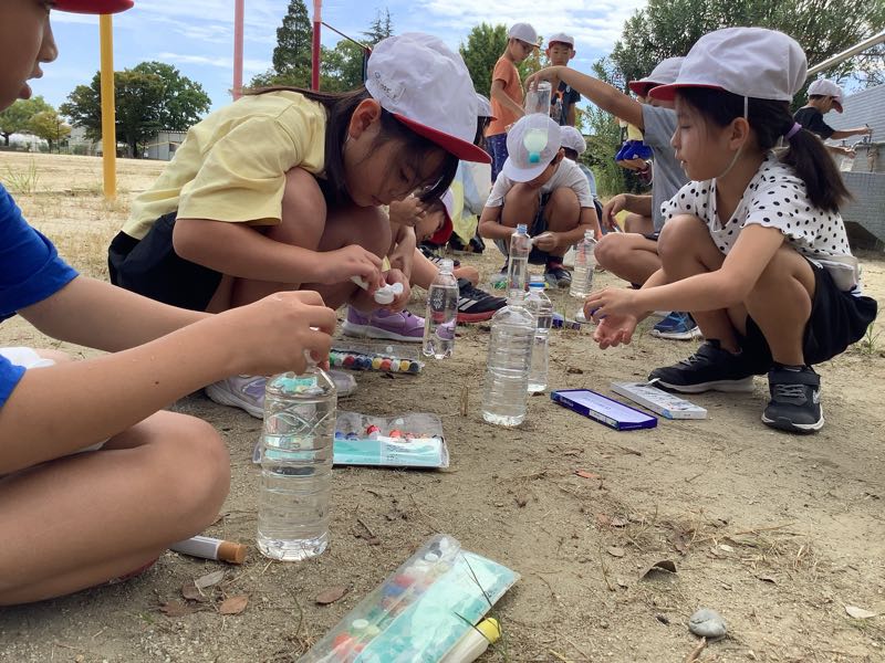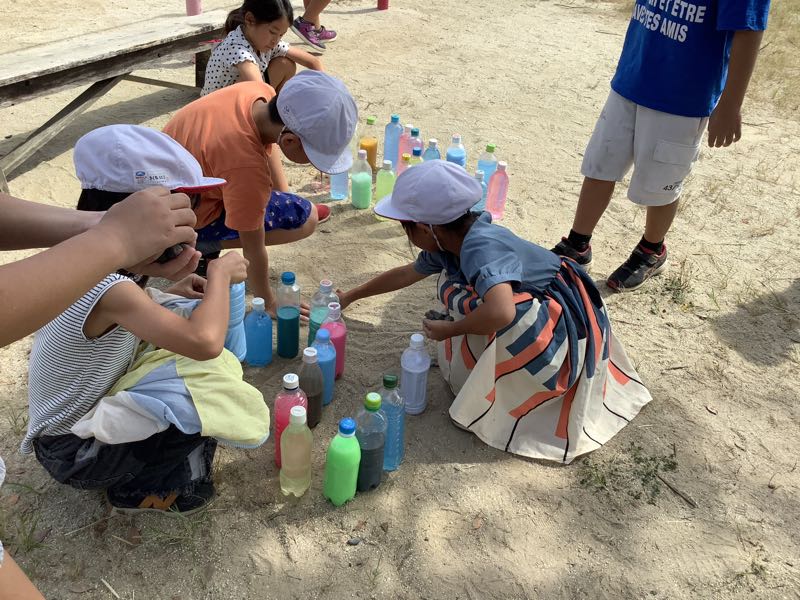 いろいろな色をまぜて、好きな色の色水を作り、光にあててみたり、お友達の色と合わせてみたりしました。 最後には、みんなの色水をならべて、展覧会をひらいて、鑑賞をしました。力を合わせて、素敵な作品ができました。