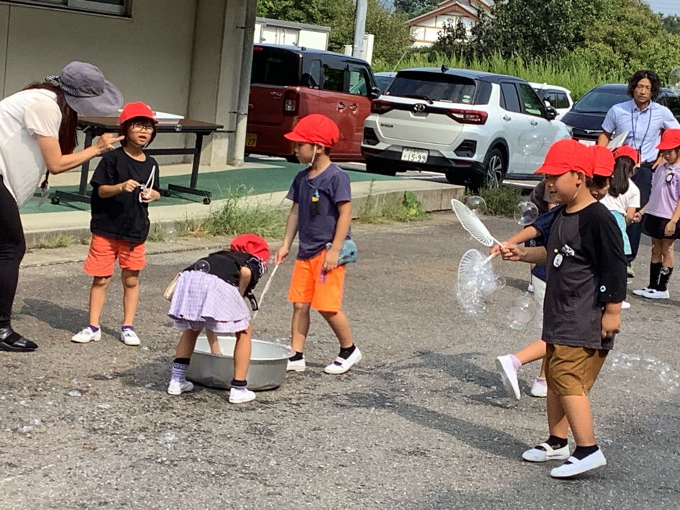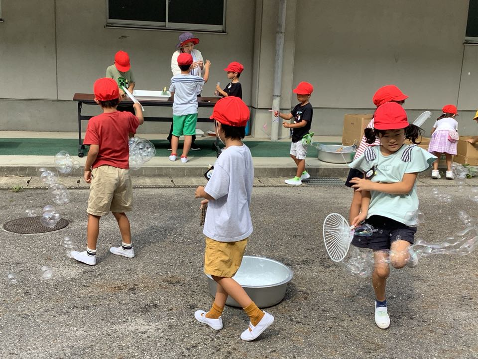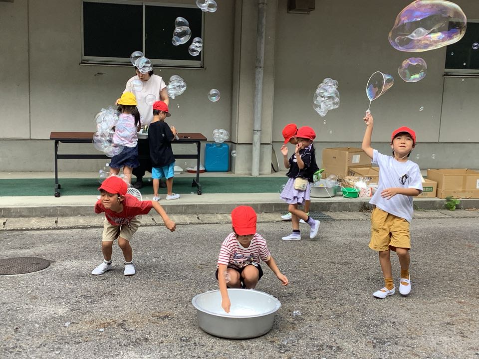 うちわやストロー、ダンボール。色々な道具を上手に使って、空いっぱいにシャボン玉が舞いました。