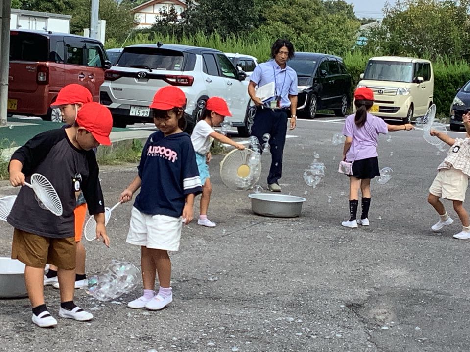 生活科でシャボン玉の学習取り組んでいる1年生。今日は、たくさんのシャボン玉をいっきに作ることを目指す「いっぱいシャボン玉大作戦」に取り組みました。どんな道具を使ってどんな使い方をすればシャボン玉がいっぱいできるのか、話し合ってからシャボン玉作りに挑戦しました。