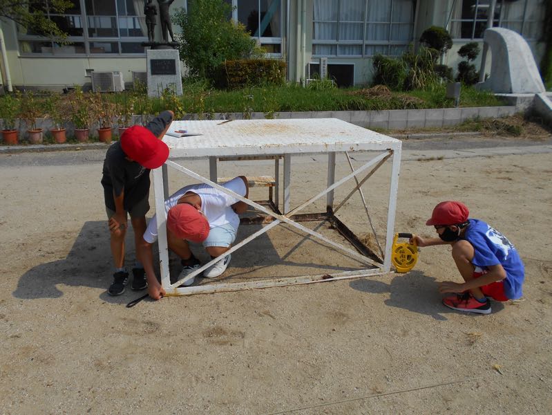 6Aは算数科で、学校内にある複合した図形の柱体をどう求めるか考えました。