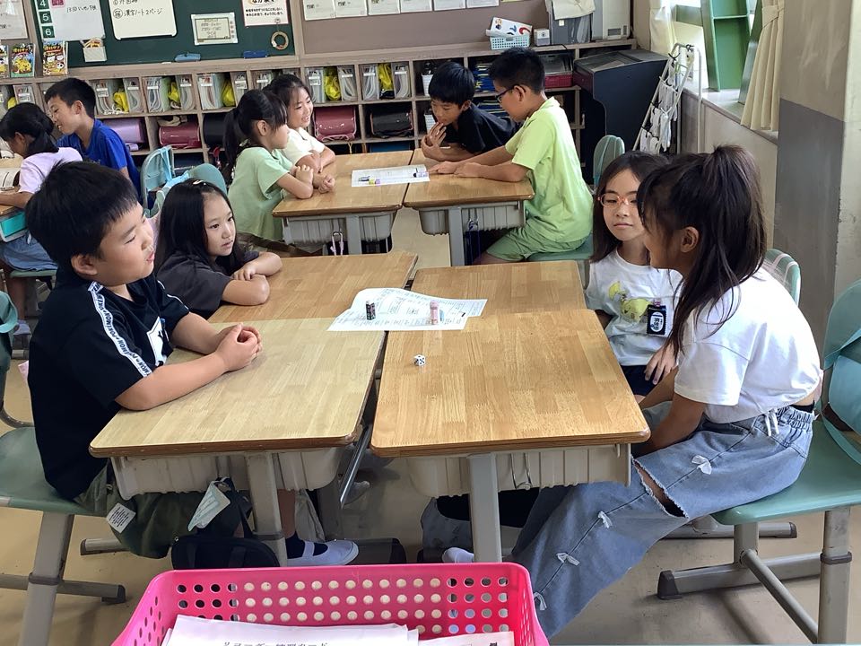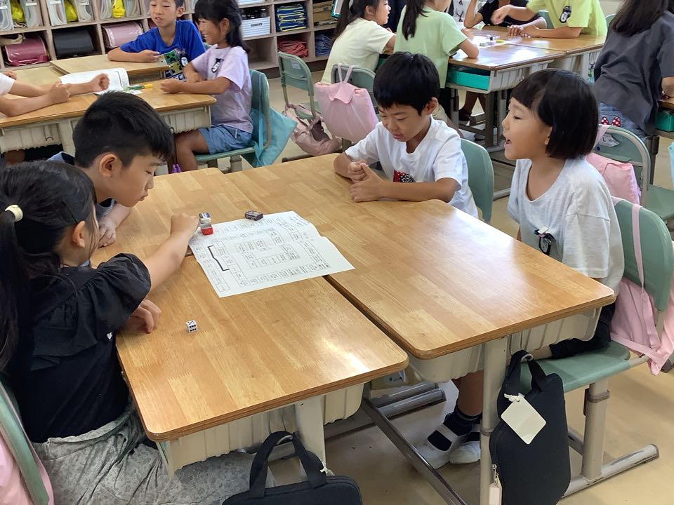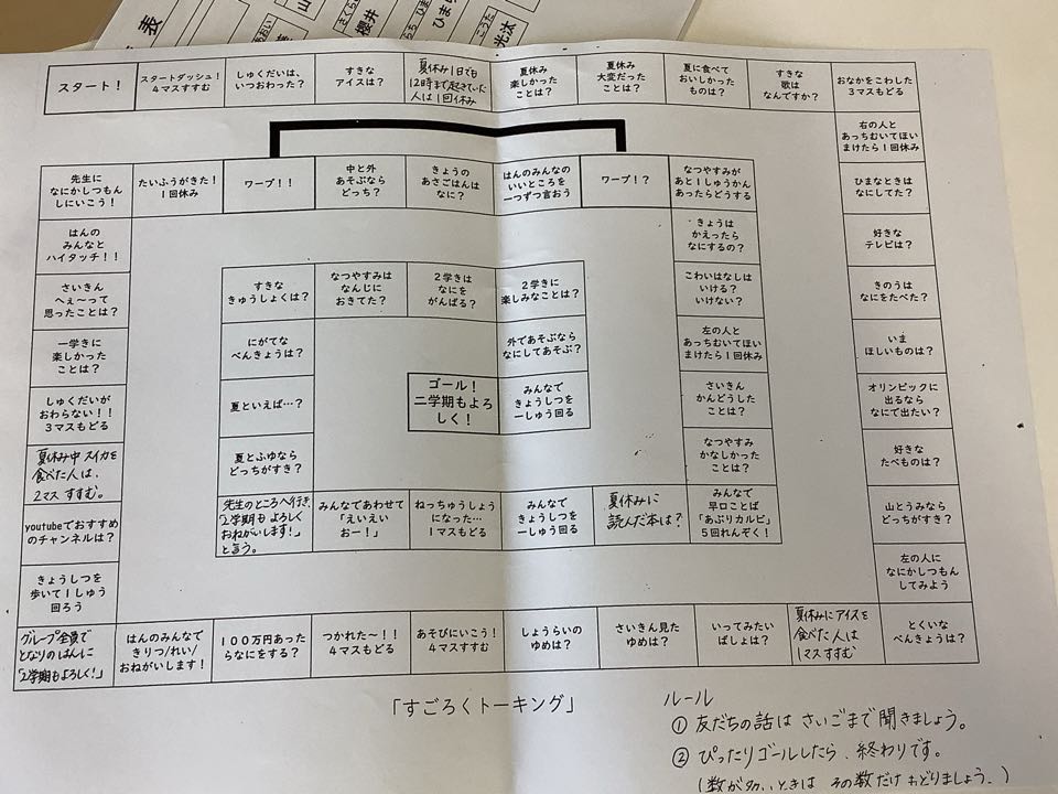 3年B組は「すごろくトーキング」に取り組んでいました。すごろくで止まったところの質問に答えたり、書いてある課題にグループみんなで取り組んだりしました。楽しみながら、お友達のことがもっと知れて、久しぶりに会った友達とも、ぐんと距離が近くなったようでした。
