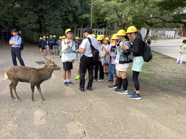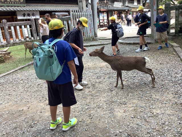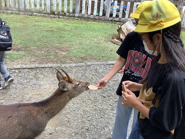 途中で鹿にせんべいをあげました。
