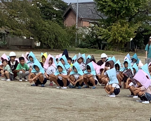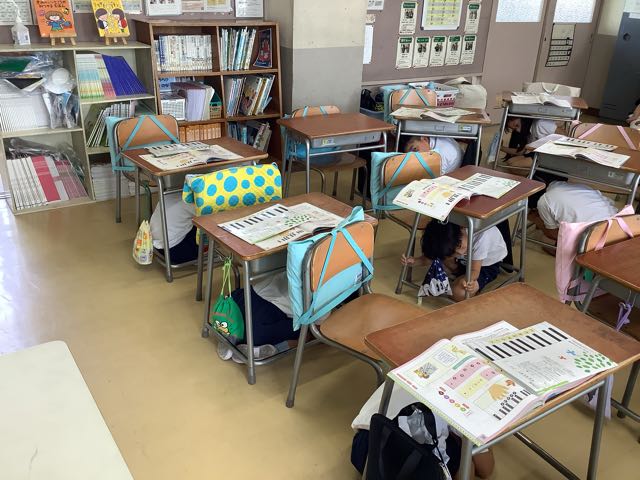 今回の避難訓練は、子どもたちには告知せずに行いました。授業中でしたが、地震発生の放送が聞こえるとすぐに机の下に避難して身を守りました。