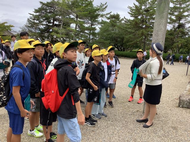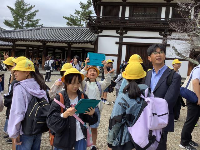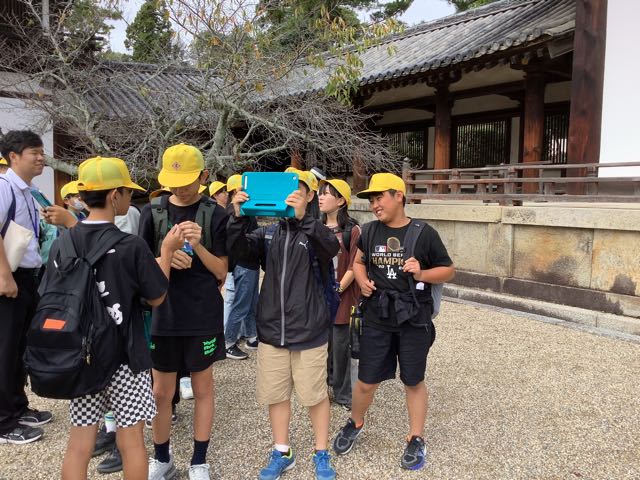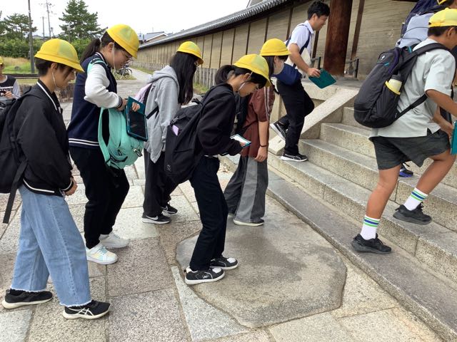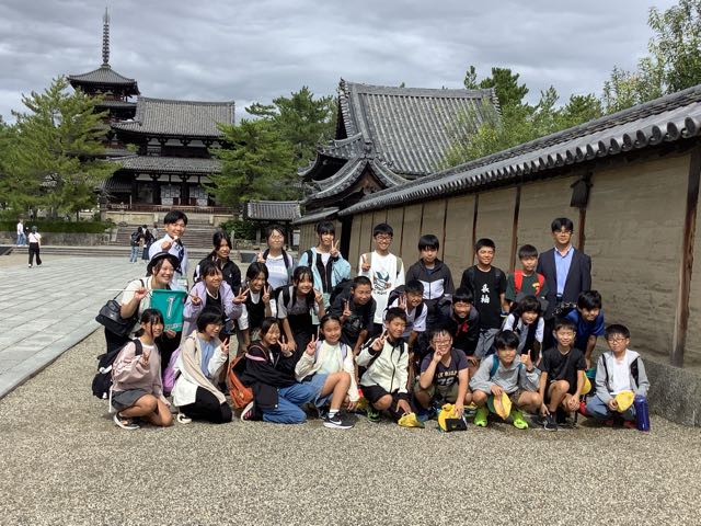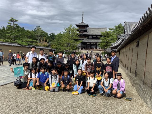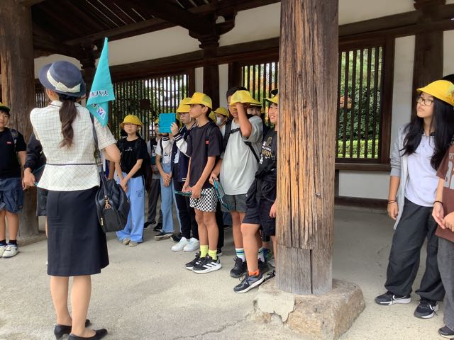 最初の見学地、法隆寺に到着しました。鯛石を踏んで、中に入ります。