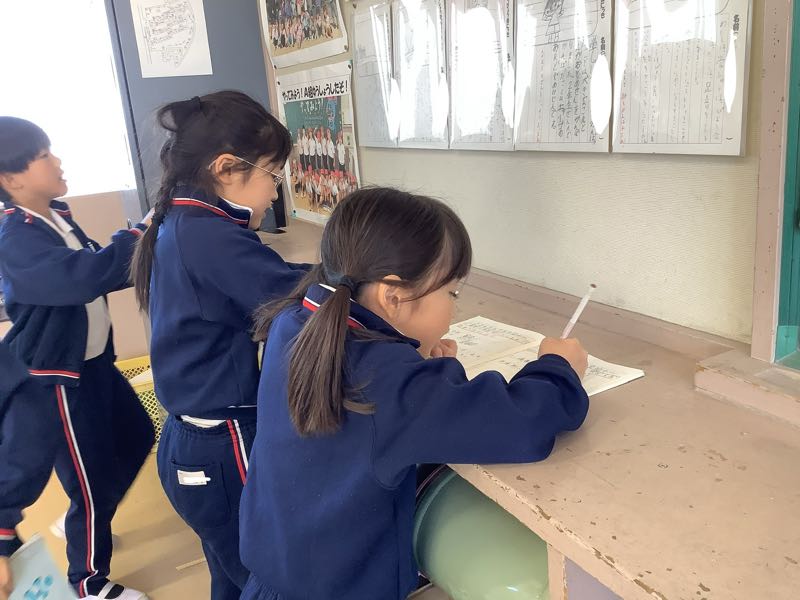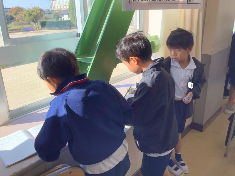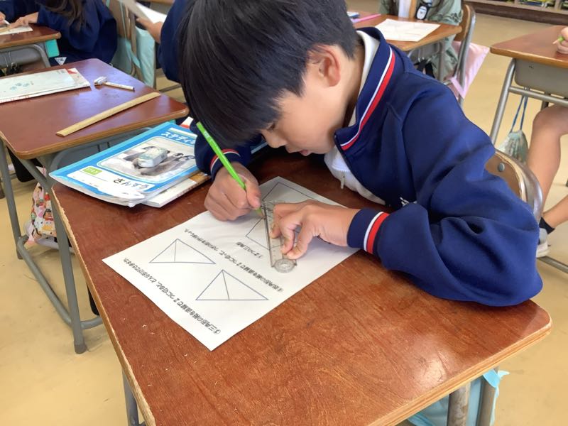 最後に、身の回りの三角形や四角形探しをしました。運動場のコーンやロッカー、プリント…などなど。発表のたびに「確かに四角形だ!」「すごい!」と、たくさんの発見をすることができました。