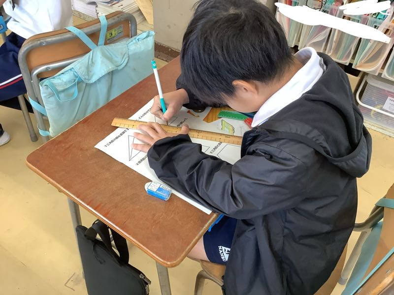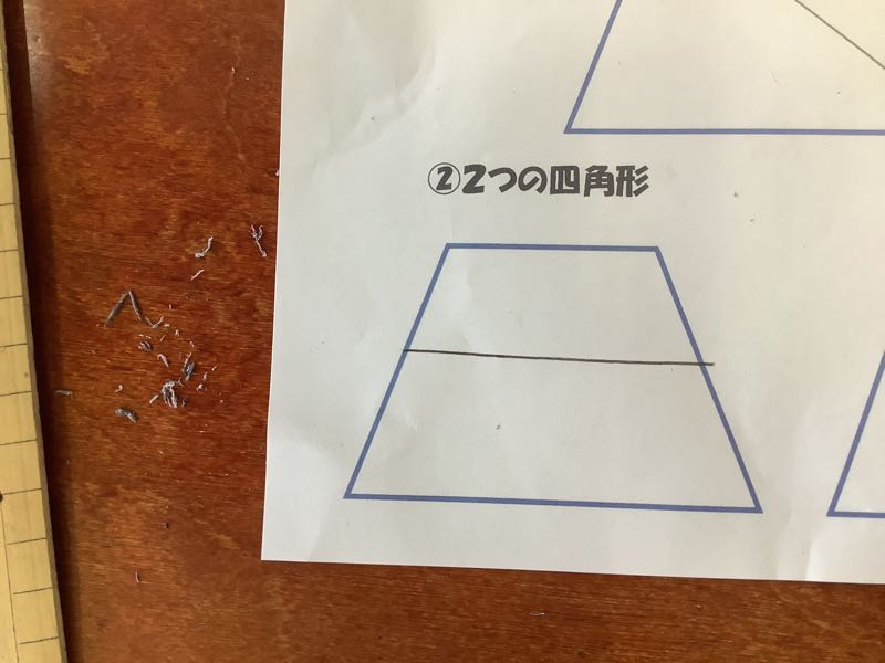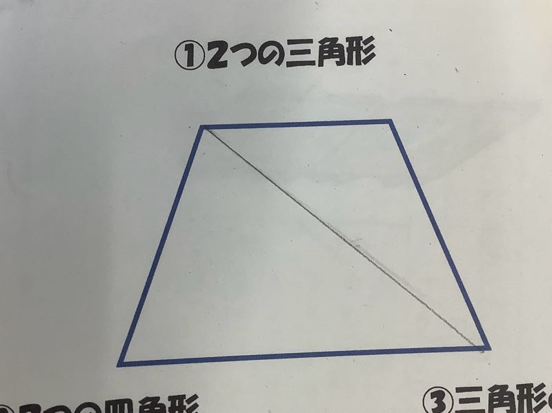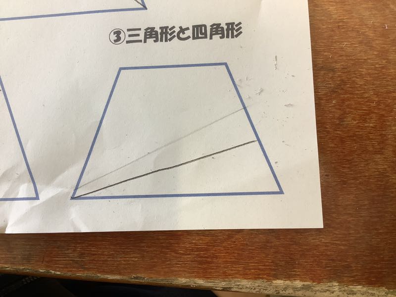 今日は、三角形と四角形に直線を引いて2つに分けると、どのような形ができるか調べました。