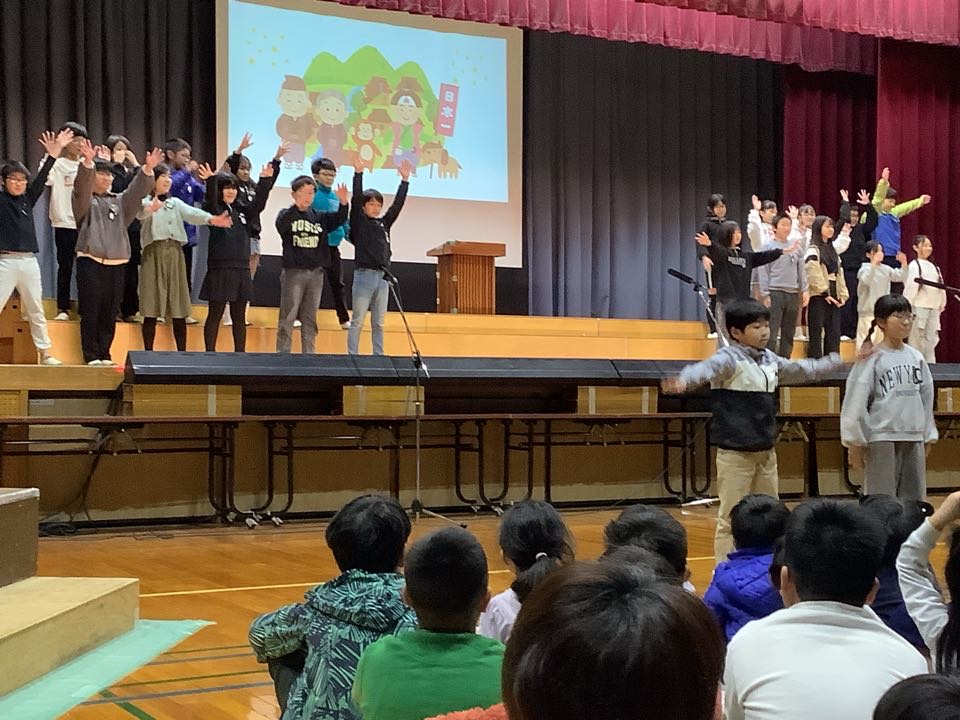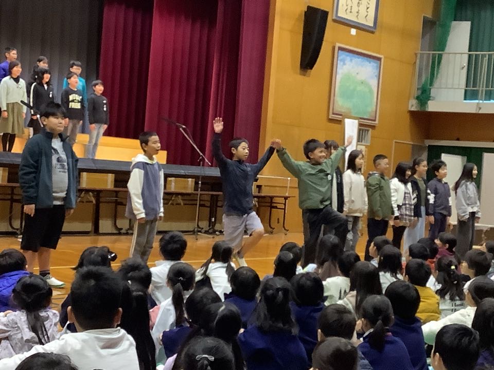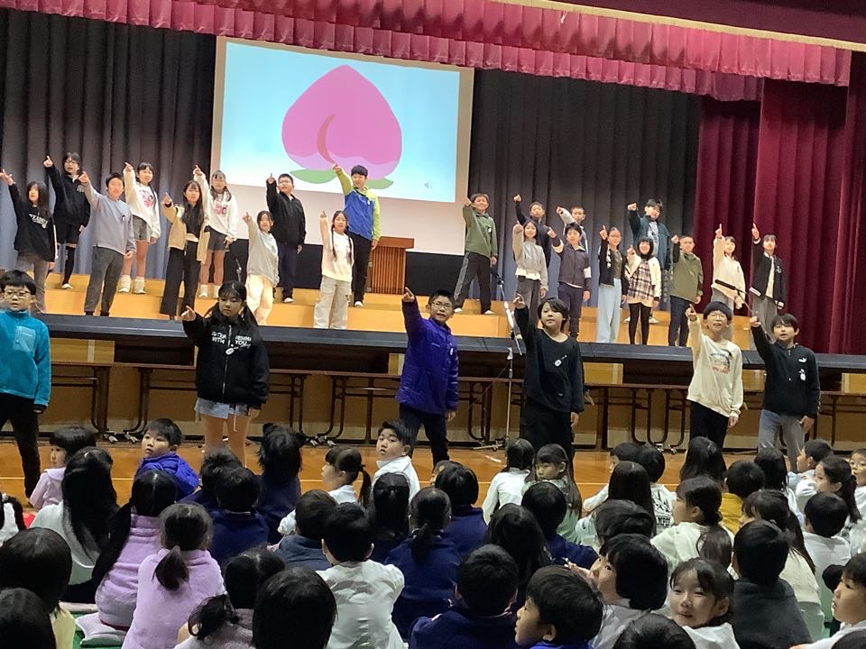 5年生は英語でお話の発表をします。演目は、「ザ ピーチ ボーイ」つまり、「ももたろう」です。クイズもあり、手遊び歌もあり、全員参加型の発表に、会場はおおいに盛り上がりました。