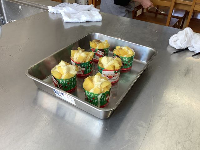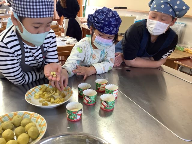 粉を混ぜて生地を作り、カップに入れてさつまいもを載せます。