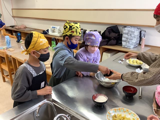 手をきれいに洗って、まずは蒸したさつまいもを潰します。