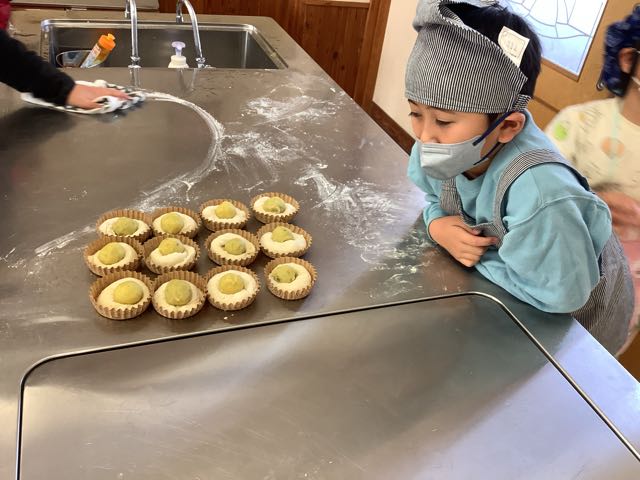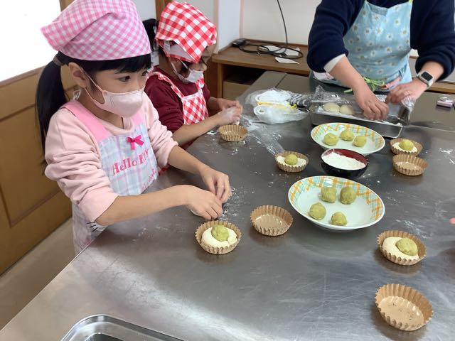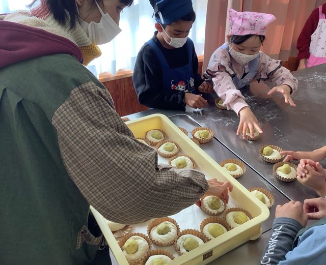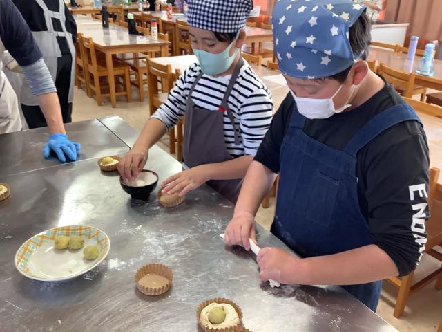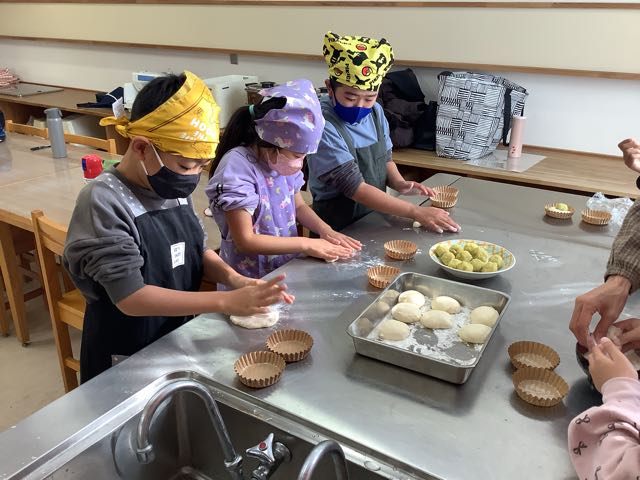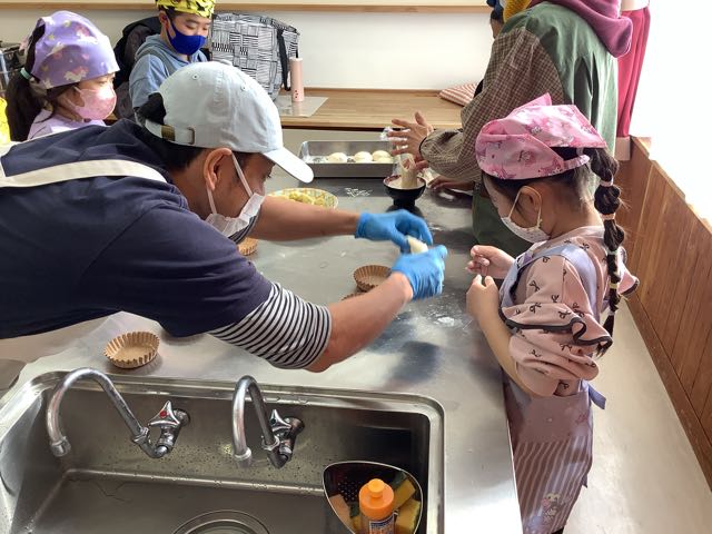 さつまいもパンは生地をのばして、中に潰したさつまいもを入れます。