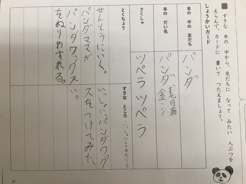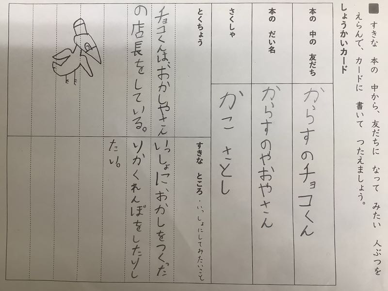 絵も交えて、カードを作ることができました。友だちの紹介カードを見て、読書の輪が広がると良いです。