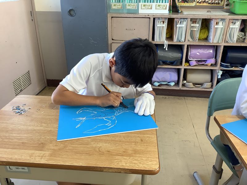 図工では、「生き物」をテーマに版画作品を制作しています。少しどきどきしながらも、彫る感触を楽しみながら丁寧に取り組んでいます。まずは、彫刻刀の種類や持ち方、安全な使い方を学びました。