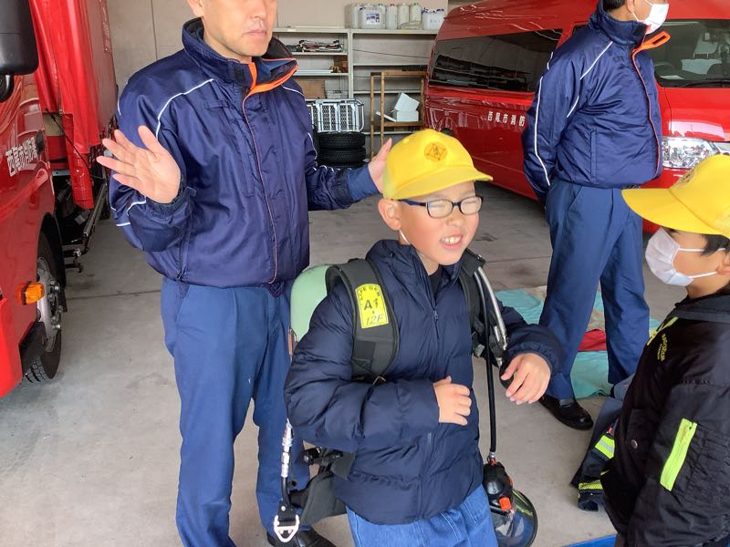 実際に消防士さんが着ている防火服やボンベ、ホースの重さも体験して、「これを着て動くのは大変だ。」と、消防士さんの仕事の大変さも感じていました。