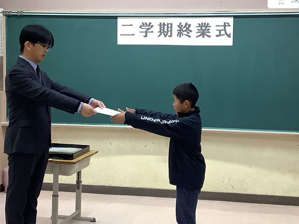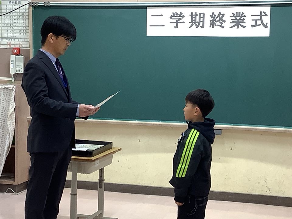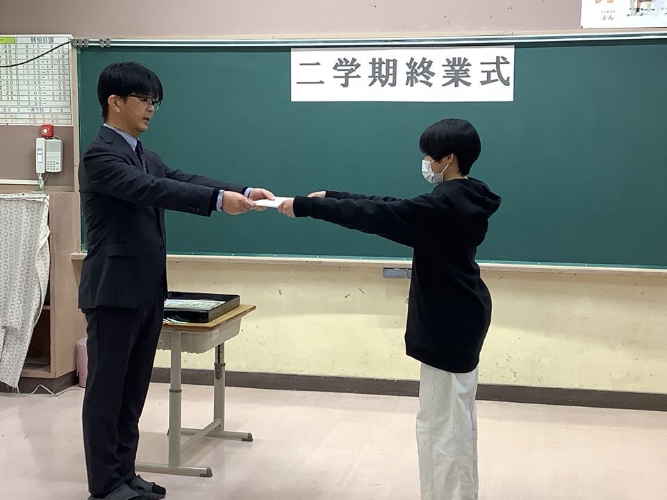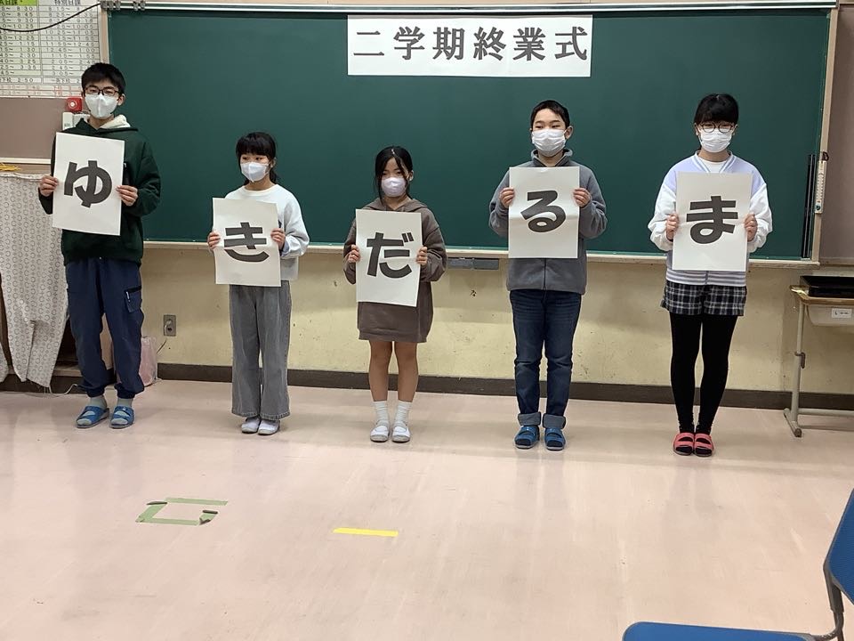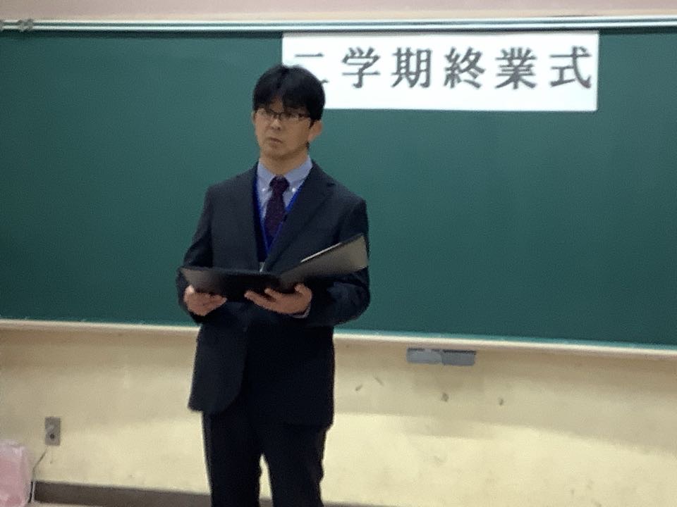残念ながら体調を崩して欠席している人が多いので、体育館ではなく、テレビ放送による終業式を行いました。