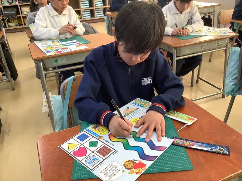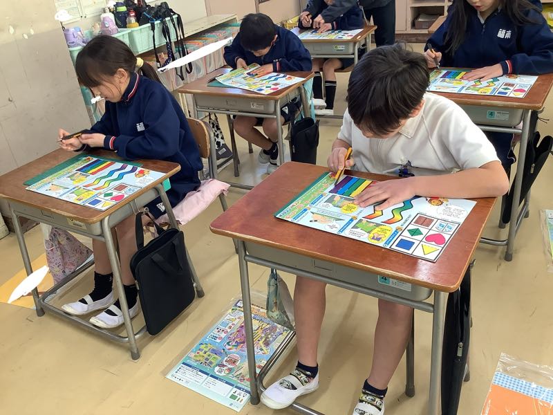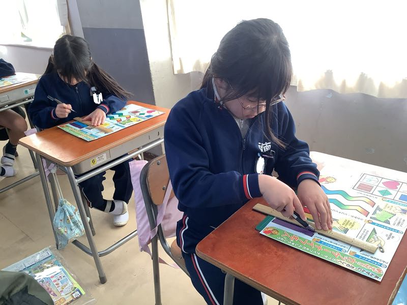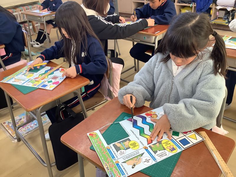 ゆっくり、慎重にカッターを持ち、直線や曲線を切る練習をしました。先生の話を真剣に聞いて、安全に取り組むことができました。