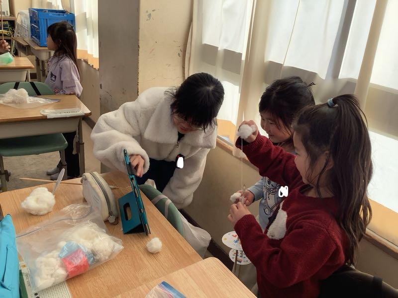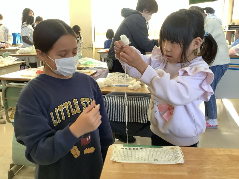 わた集会に向けて、1年生と6年生で糸つむぎの練習をしました。