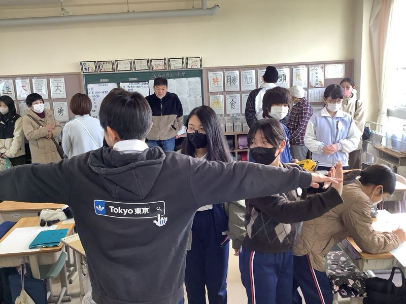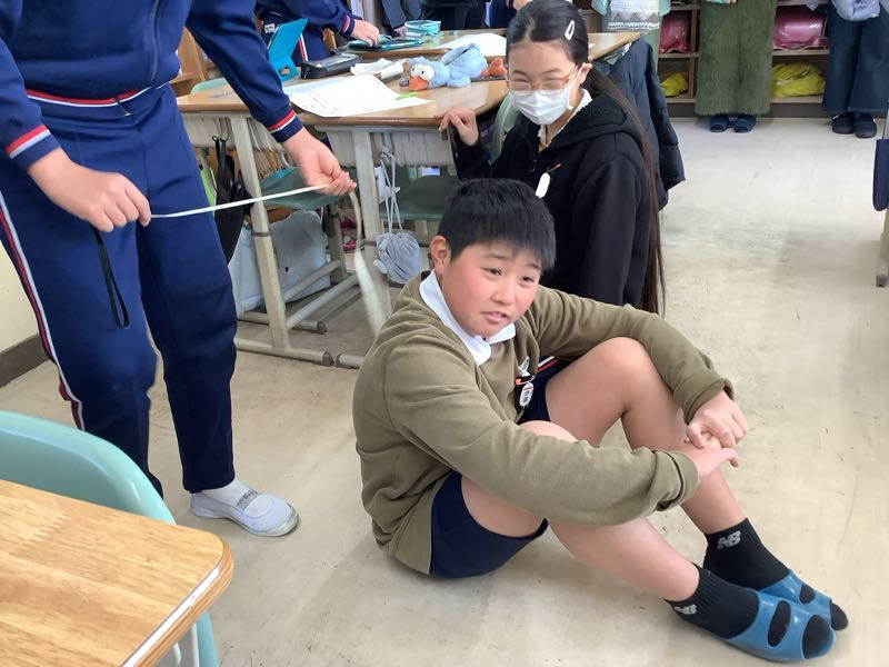 授業は算数科で、教室に机や人がいくつ入るのかを求めました。巻尺や自分の体を使って、およその面積を求めることができました。