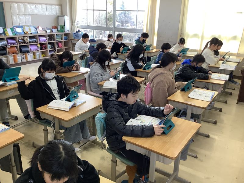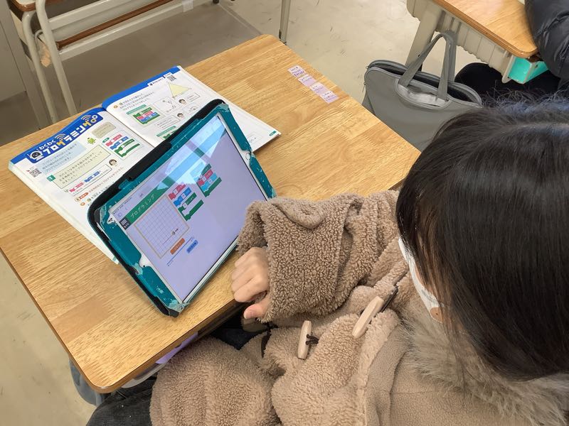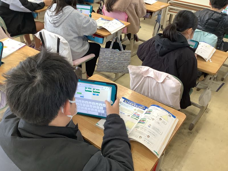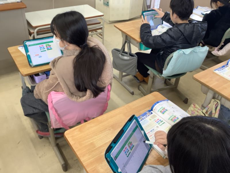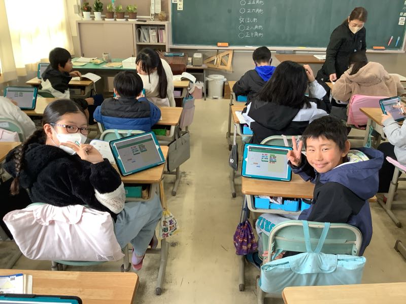 算数で正多角形の学習をし、正六角形や正八角形をコンパスや分度器を使って作図できるようになりました。授業では、プログラミングを使っていろいろな正多角形をつくるのに挑戦しました。