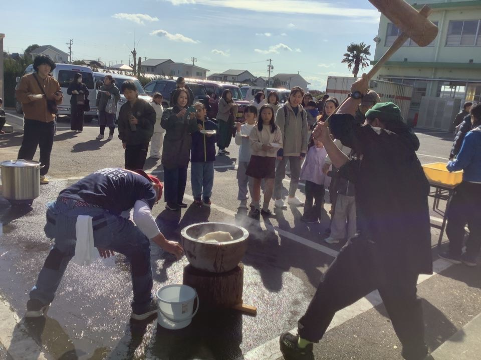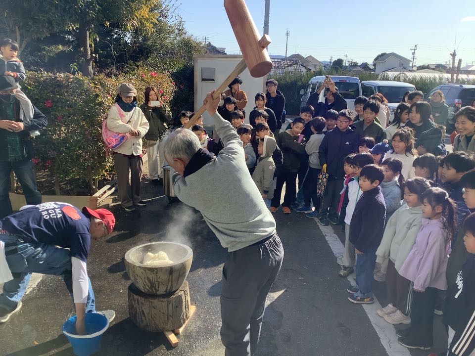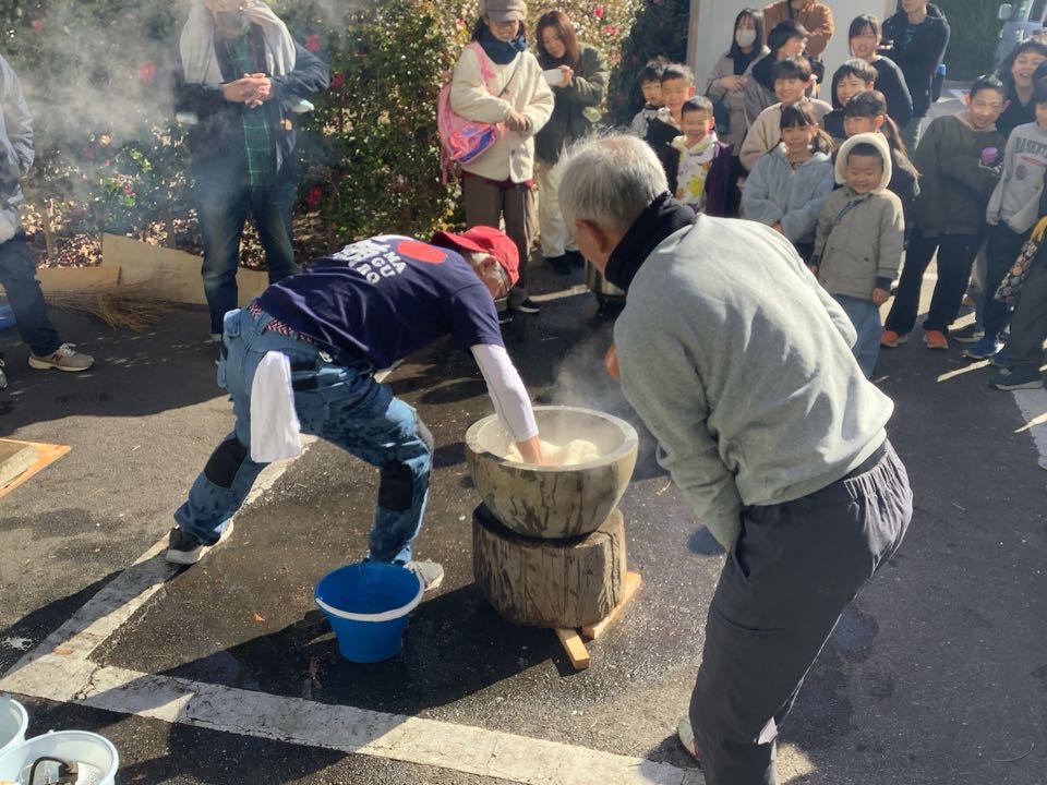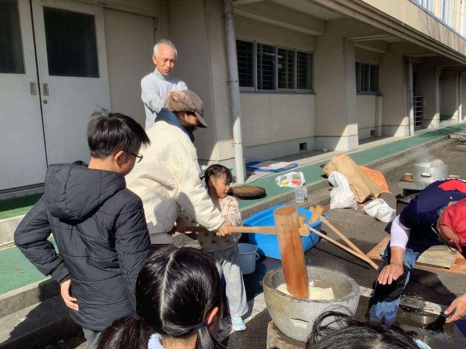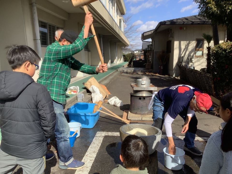 今日はおやじの会の日です。和室の隣の駐車場で、石臼ときねで餅をつきました。ベテランのおやじさんの技に、みんな見入っていました。