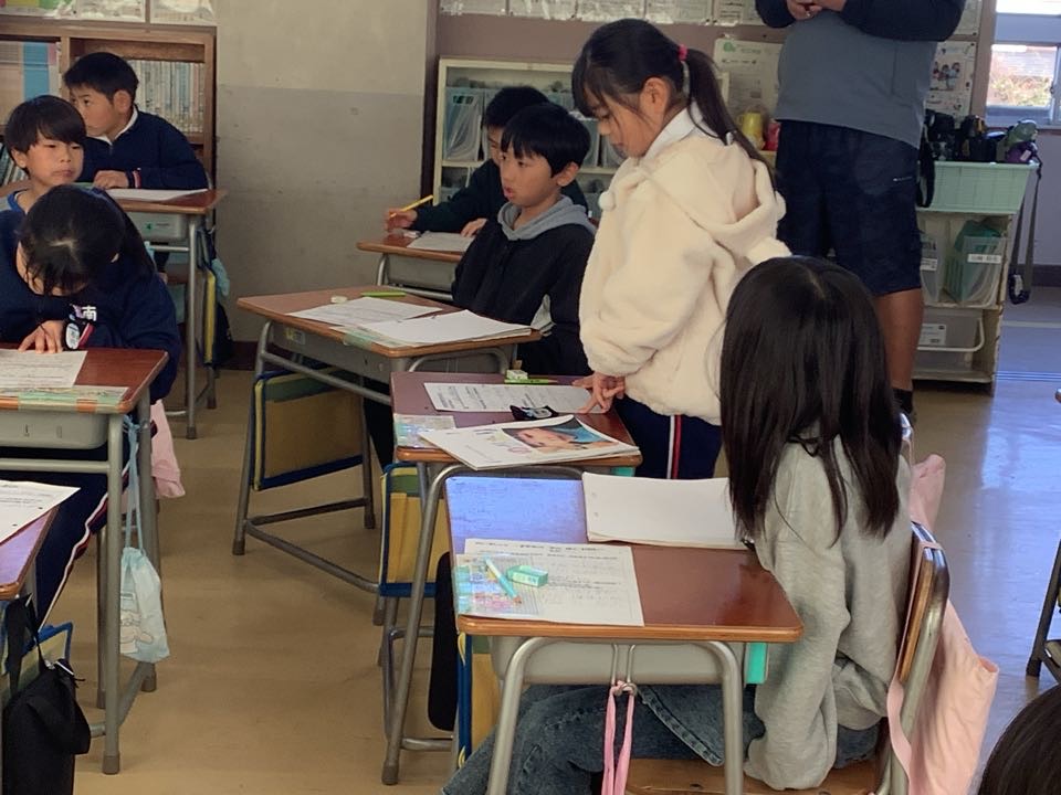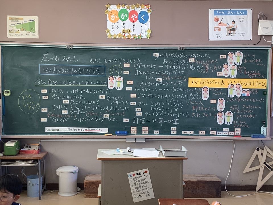 2年生は生活科で、今までの自分の成長を振り返る学習をしています。どんなことができるようになったか。どういうところが成長したか。成長した理由は何か。いろいろことを調べたり、インタビューしたりして、プリントにまとめています。