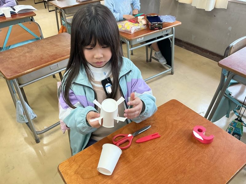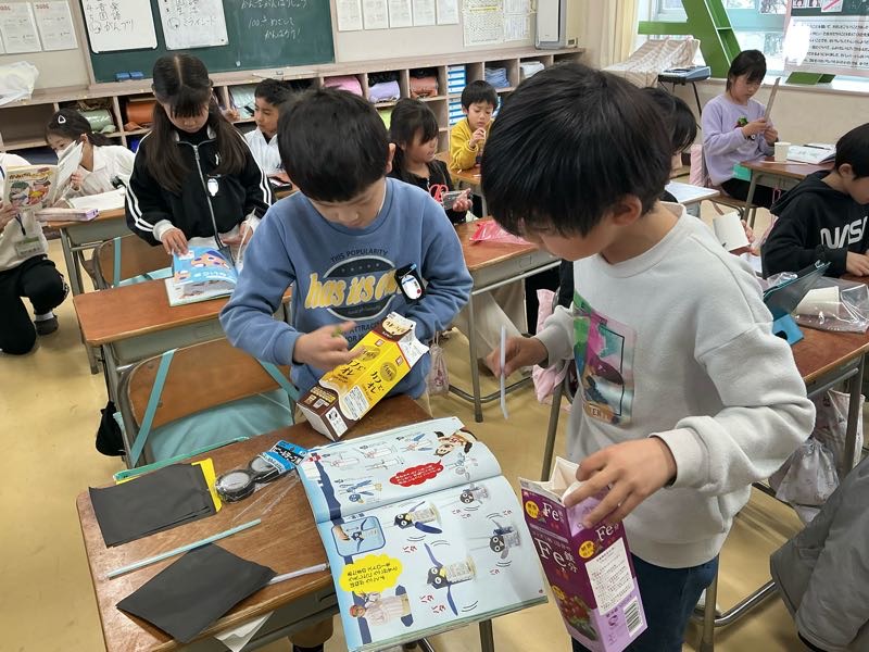 生活科では、自分たちでおもちゃを作り、みんなで楽しむことを目標に進めています。たくさん調べて材料を揃え、てきぱきと作っていきます。