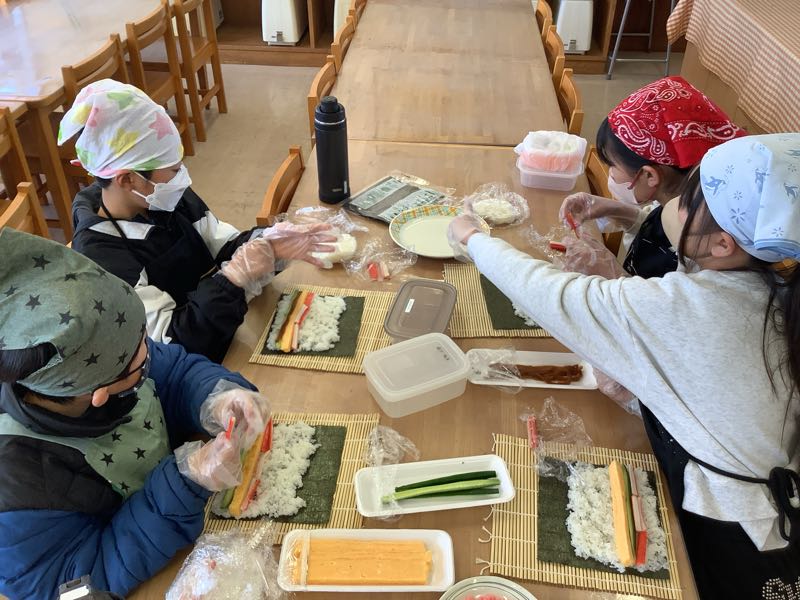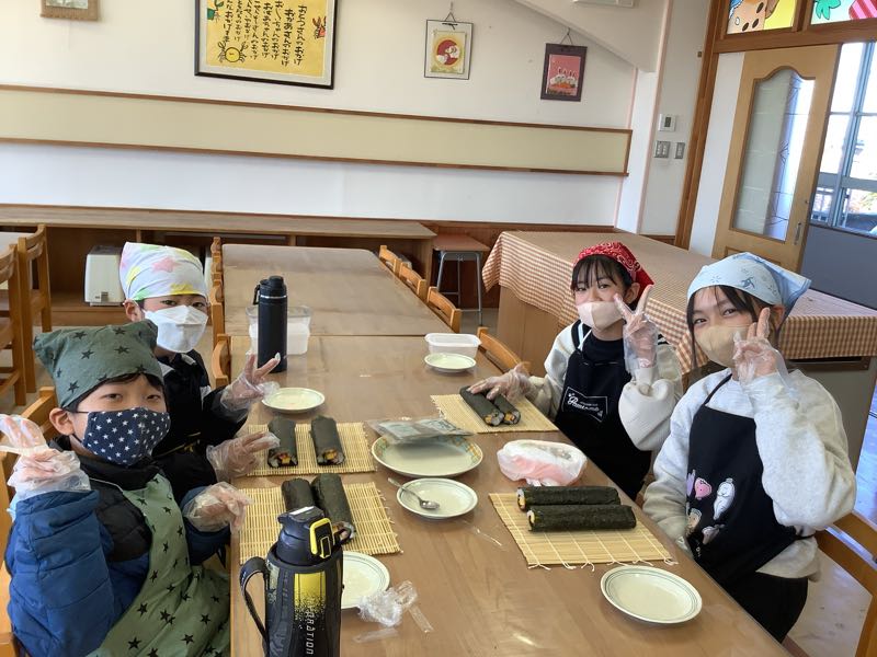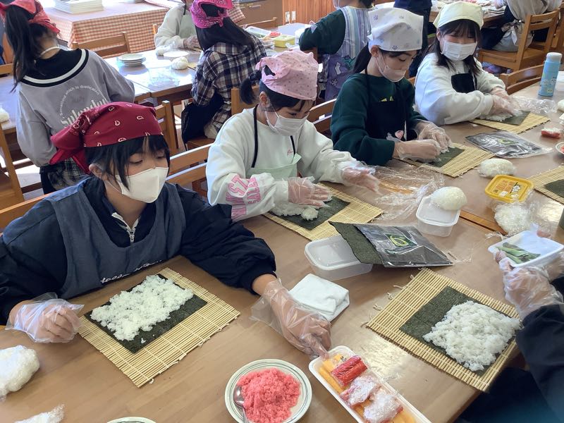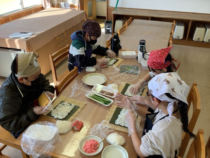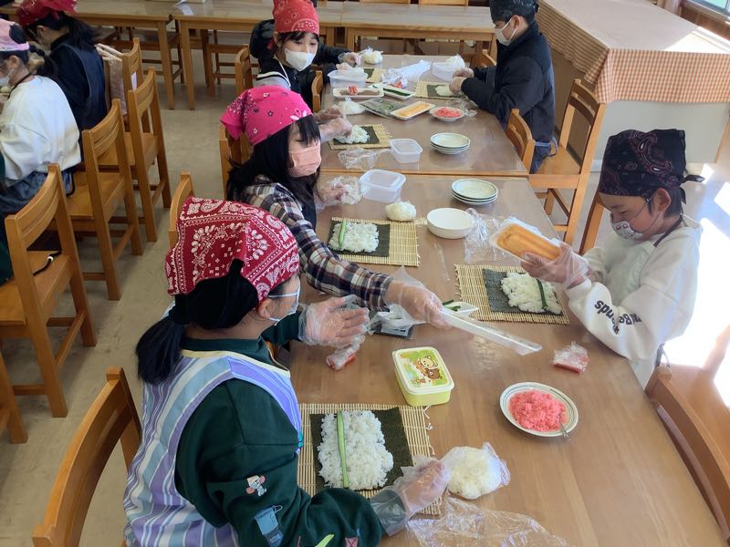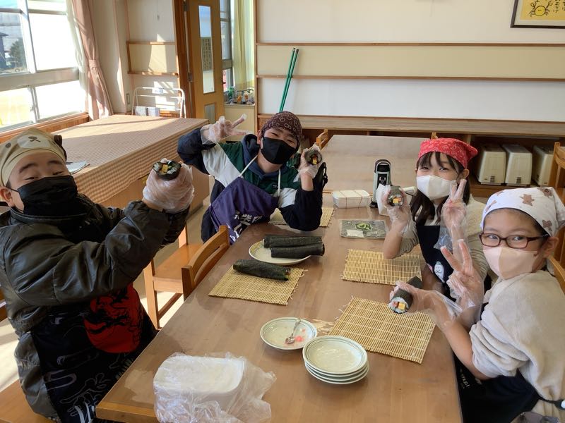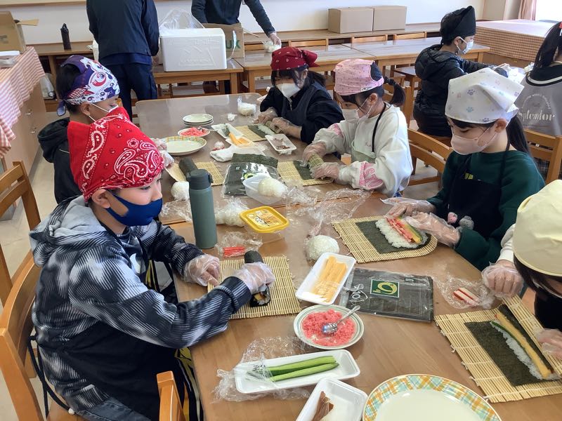 自分たちで育て、収穫したお米を使って巻き寿司を作りました。初めて作る巻き寿司に苦戦しながらも、具材の位置をアレンジしながら自分だけの巻き寿司を作ることができました。