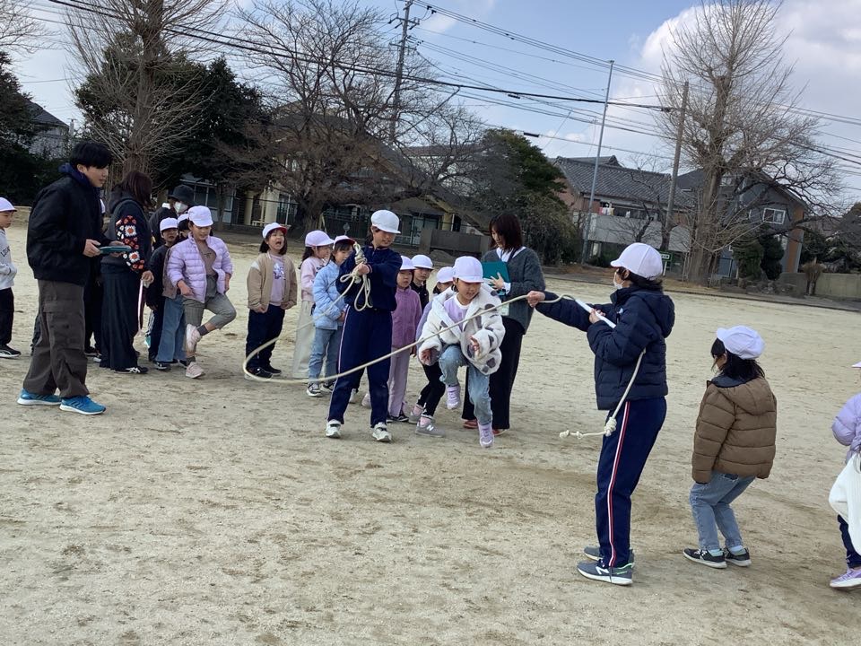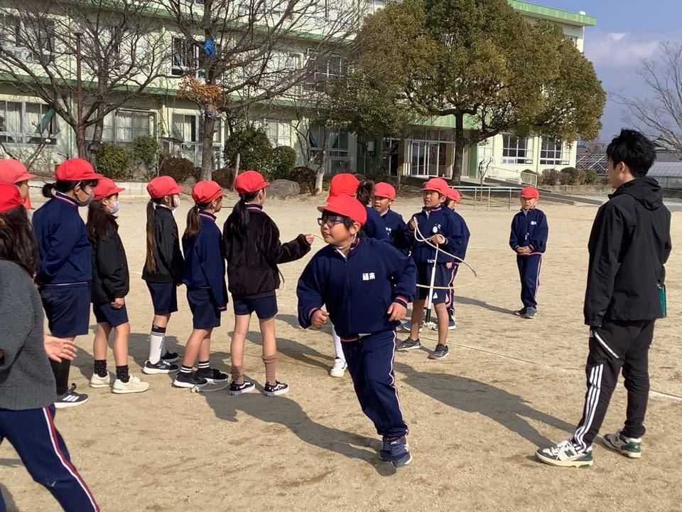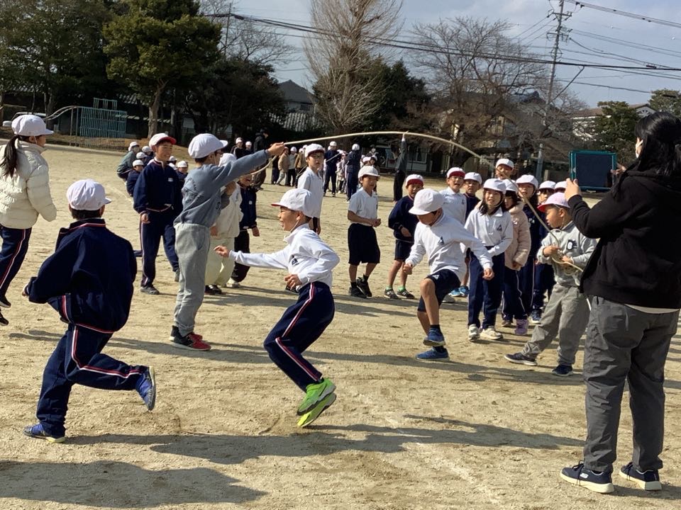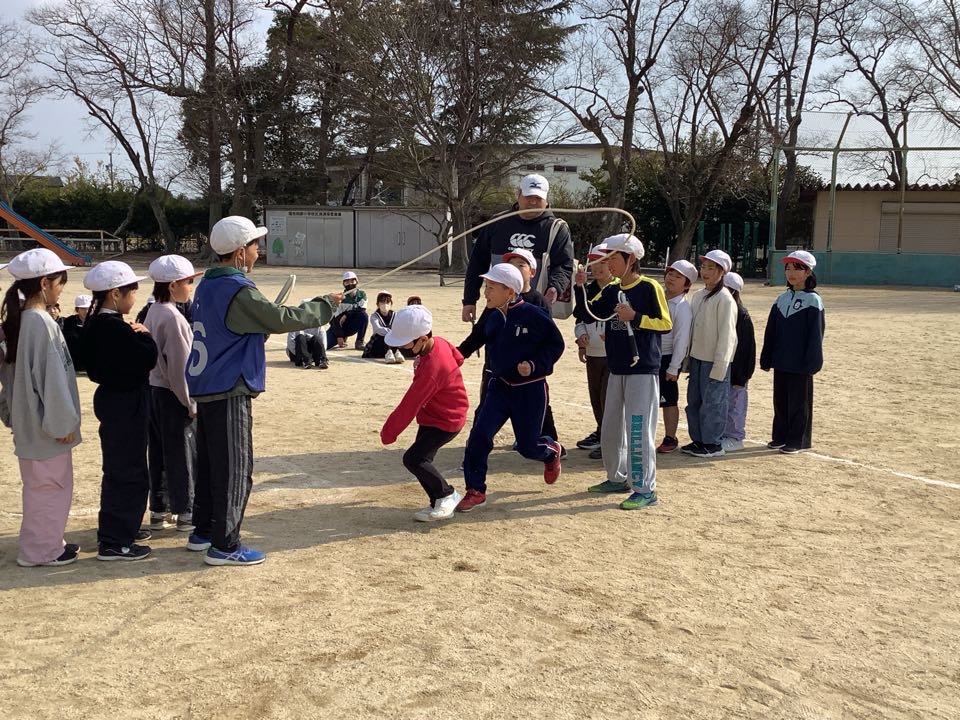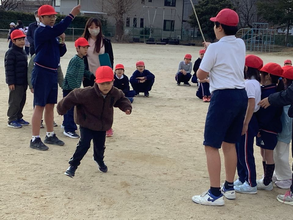 少し練習した後は、低学年の部の大会です。高学年が大なわを回し、応援します。