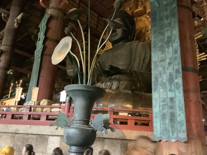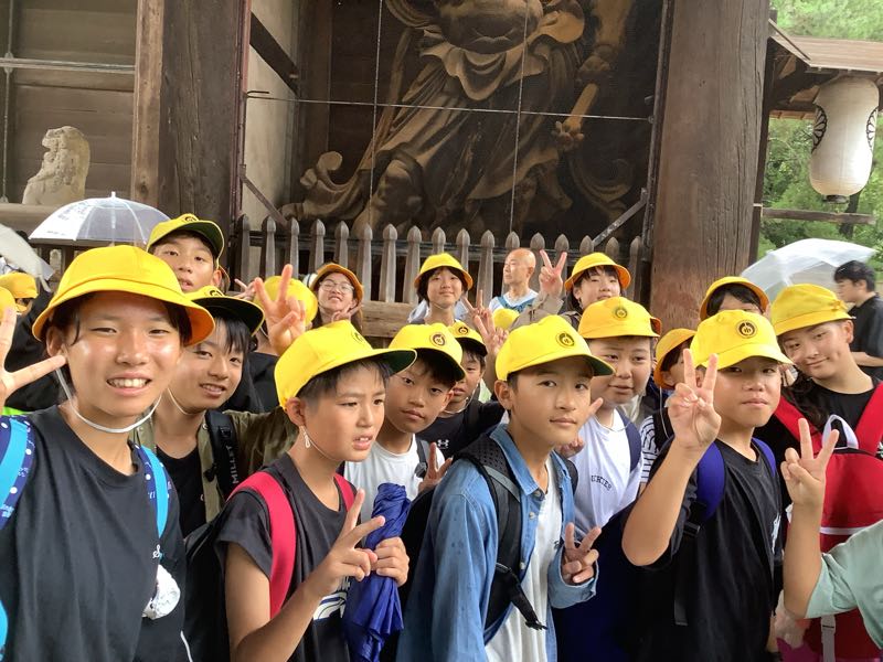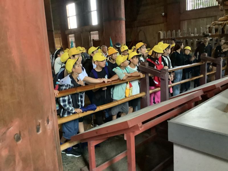 東大寺に着きました。雨が少し降っていますが、間近に立つ大仏の大きさに目を丸くして見学していました。