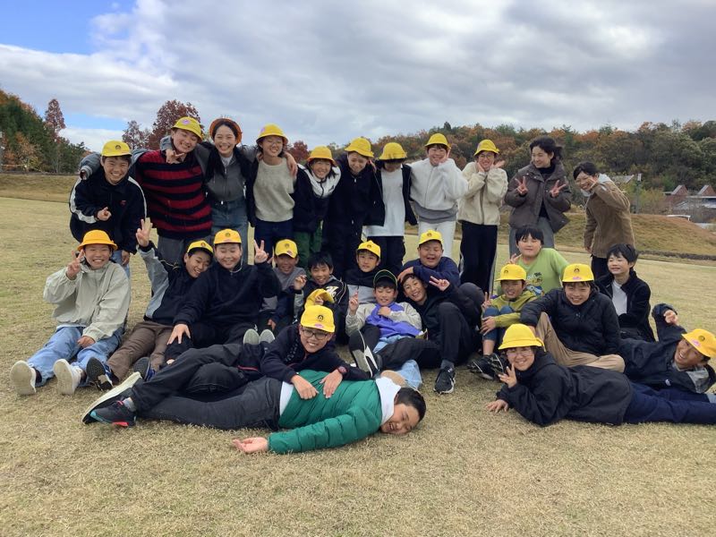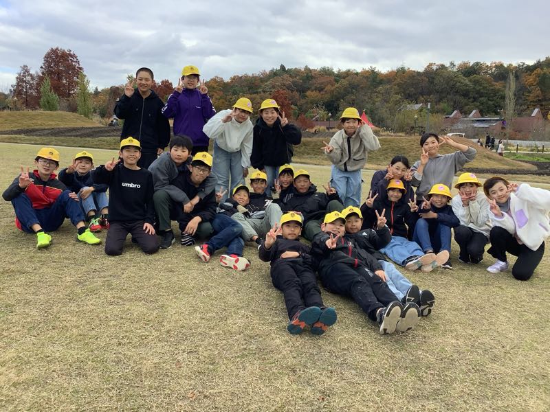 ジブリの大倉庫を見学後、芝生の上でみんなでお弁当を食べました。少し寒くなってきましたが、今おにごっこが始まりました。