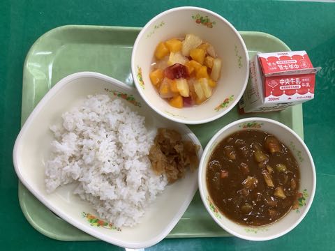 麦ご飯 牛乳シーフードカレーぶどうゼリーのフルーツポンチ福神漬け